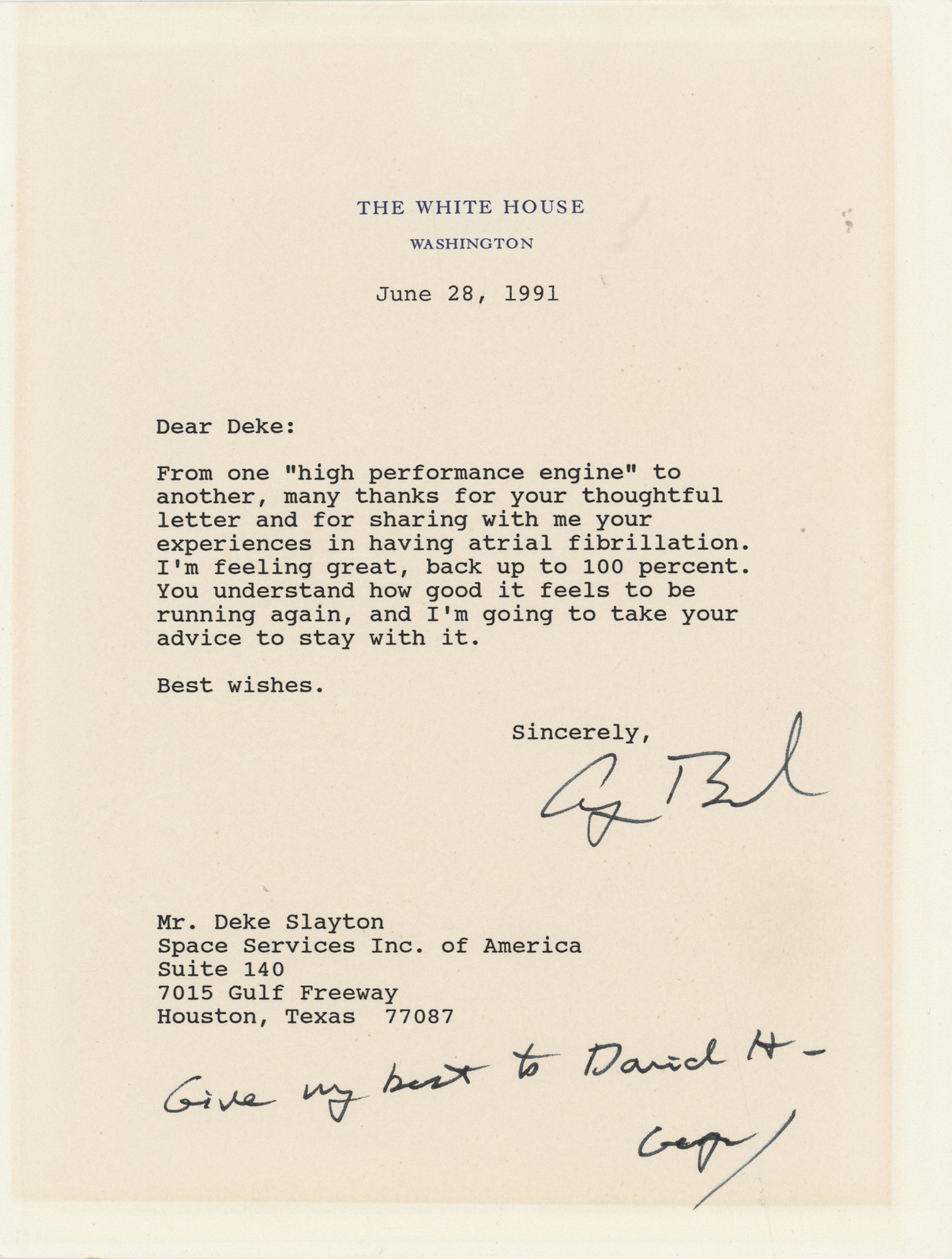 On May 4, 1991, while jogging at Camp David, President George Bush experienced shortness of breath and chest tightness. He was immediately rushed to the hospital, where he was diagnosed with atrial fibrillation, an irregular heart rhythm. This letter highlights a common, debilitating condition shared by the president and the astronaut. Slayton was scheduled to pilot the second U.S. crewed orbital spaceflight, but was grounded in 1962 by atrial fibrillation. In March 1972, he was medically cleared to fly and served as the docking module pilot for the 1975 Apollo–Soyuz Test Project.