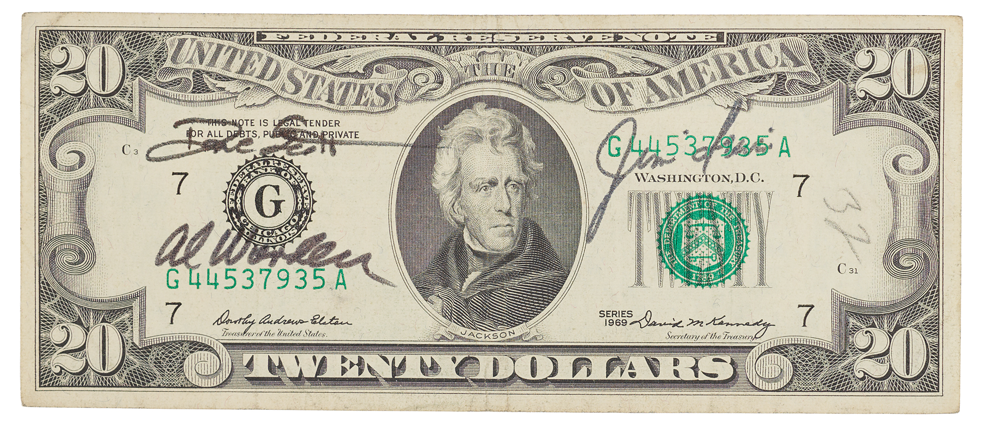 Flown Series 1969 twenty-dollar bill, serial number G44537935A, carried on the Apollo 15 Command Module 'Endeavour,' signed on the portrait side in black felt tip by Dave Scott, Jim Irwin, and Al Worden. In fine condition.