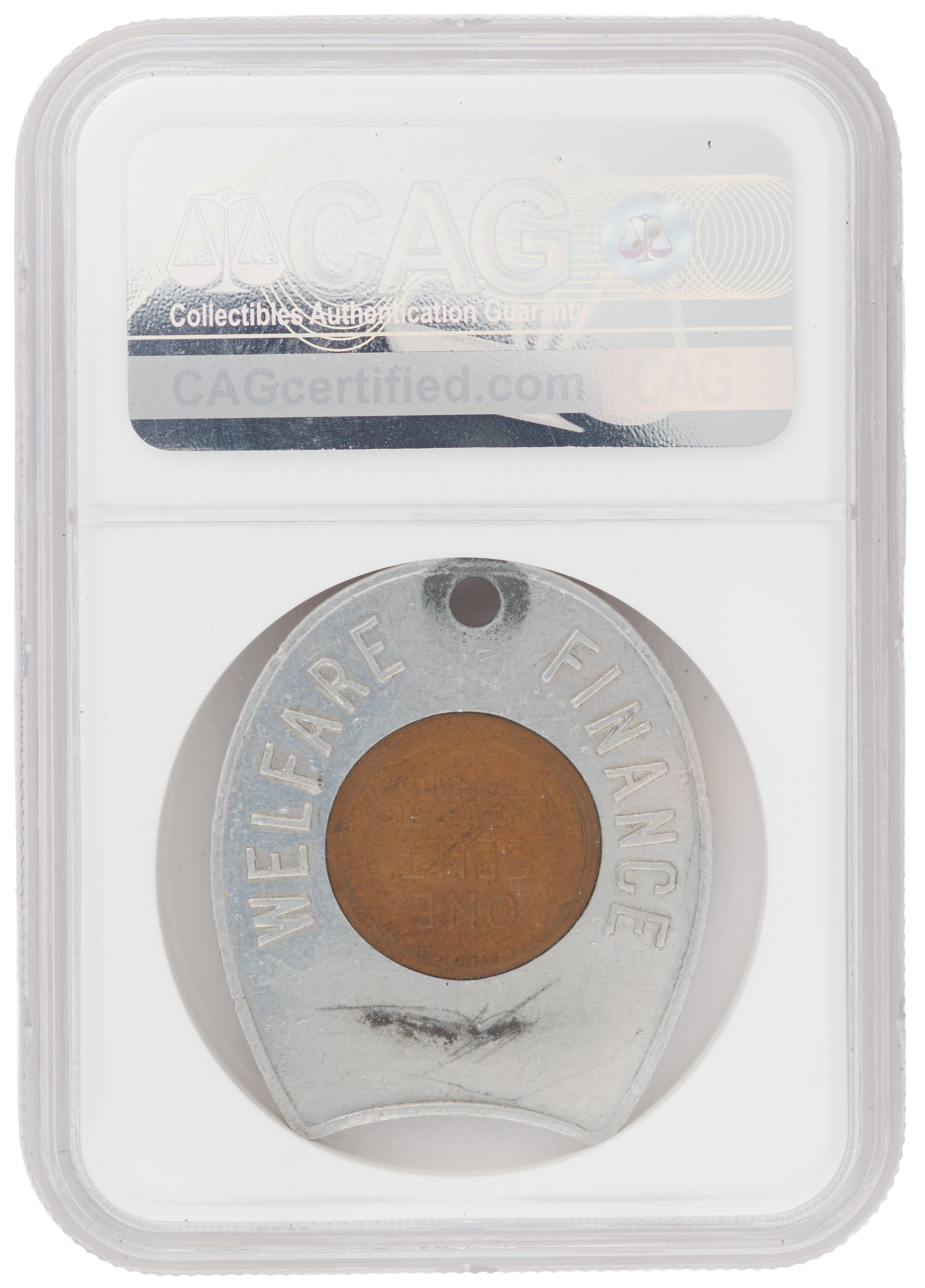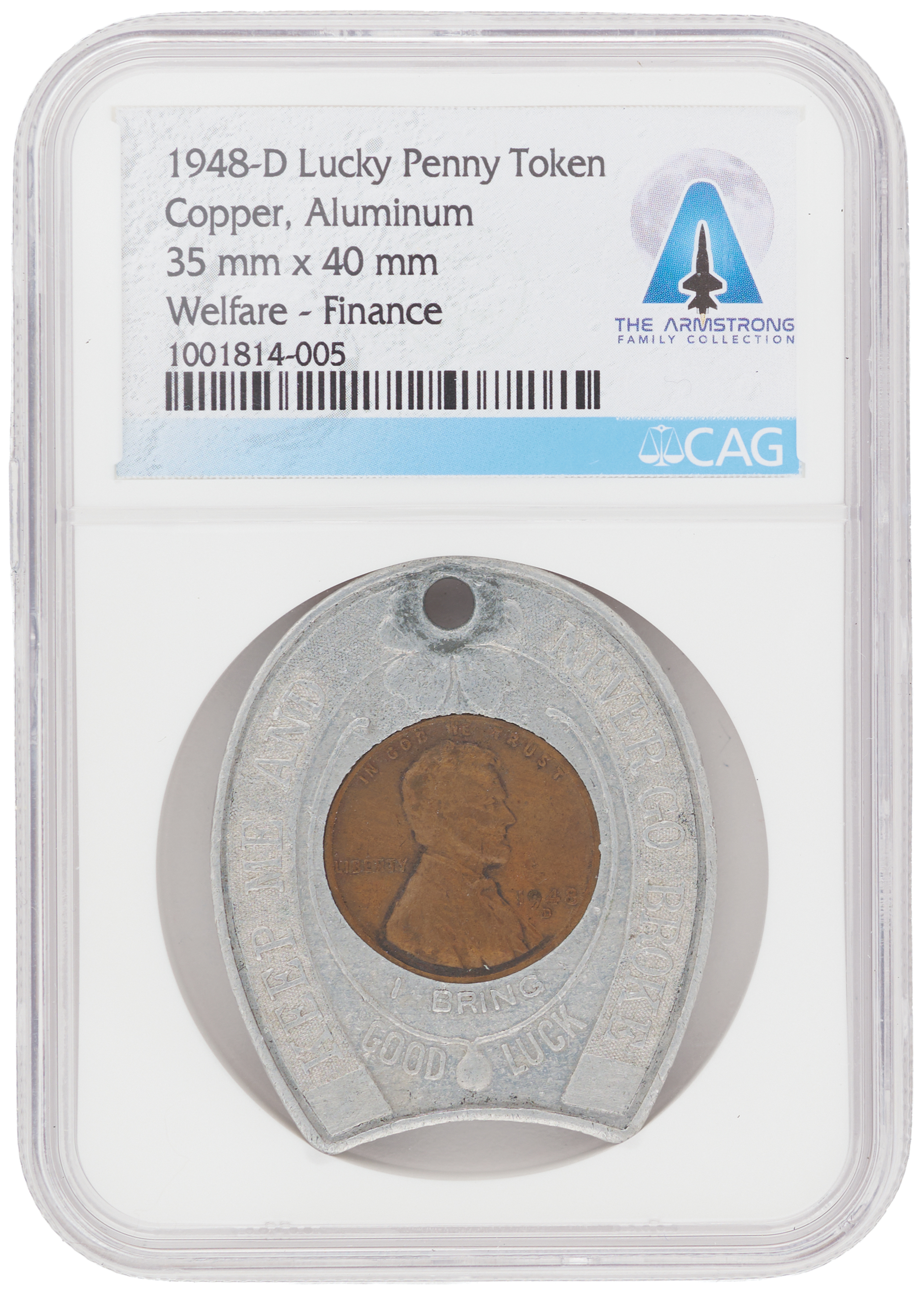 An interesting keychain-style aluminum token featuring an embedded 1948-D Lincoln cent, measuring approximately 1.25˝ x 1.5˝, with the borders reading: "Keep Me and Never Go Broke, I Bring Good Luck." The reverse reads: "Welfare Finance." Encapsulated by CAG as being from the Armstrong Family Collection. Based on the amount and placement of wear, it seems probable that Neil Armstrong used this as a 'lucky' pocket piece or on a keychain for many years. Accompanied by a letter of provenance from The Armstrong Family Collection, signed by Armstrong's sons, Rick and Mark.