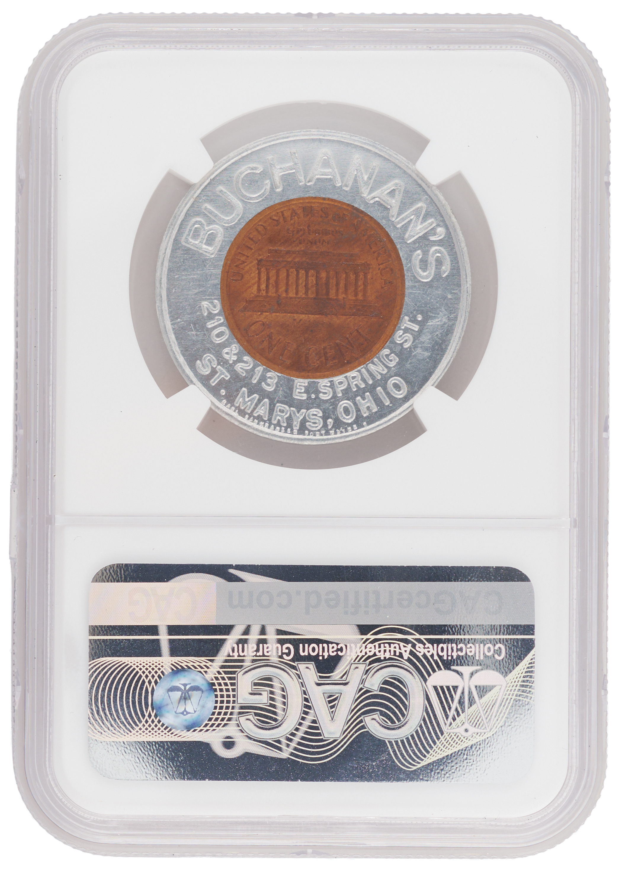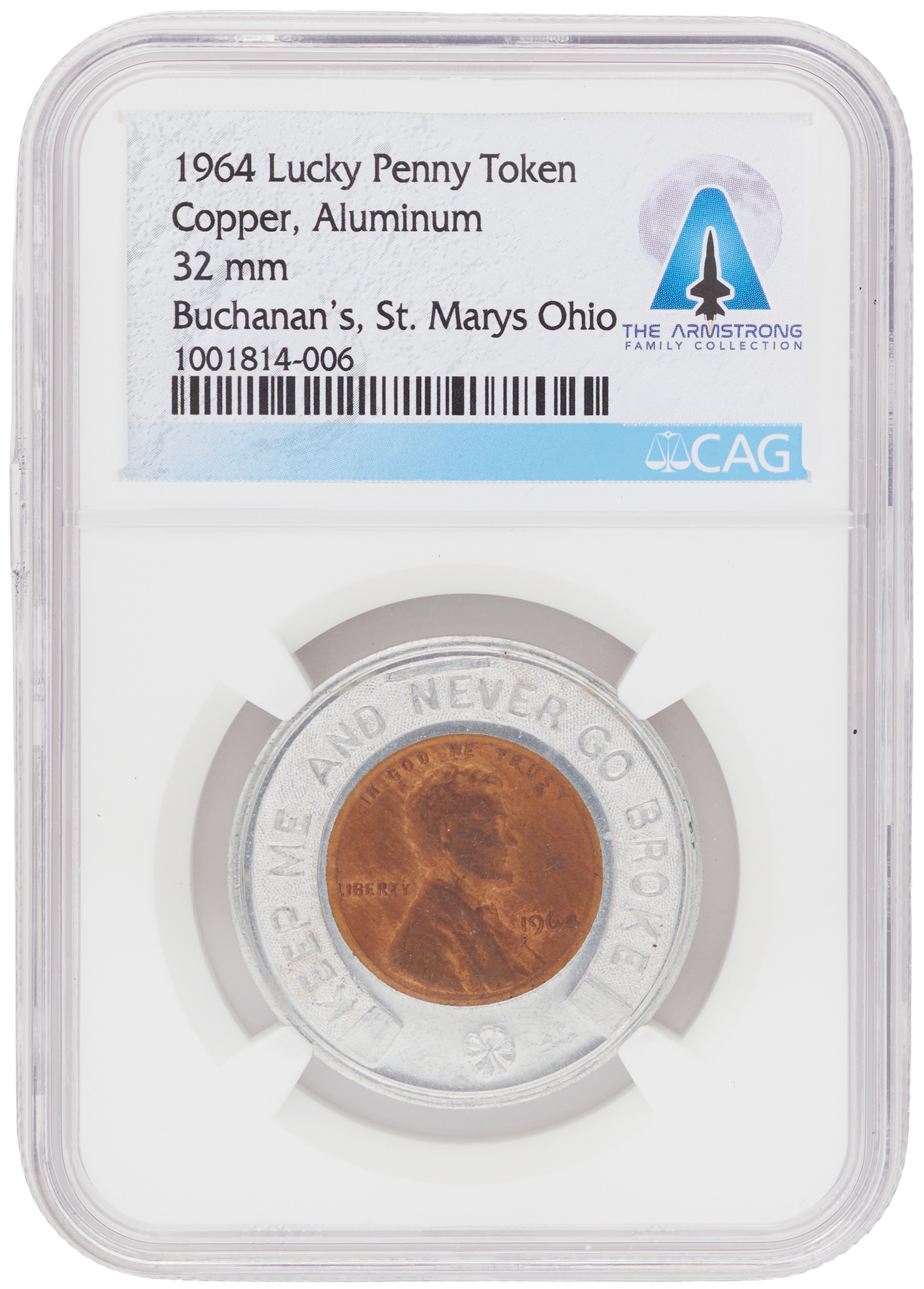 Appealing lucky penny token from Buchanan's Department Store in St. Mary's, Ohio, measuring 1.25˝ in diameter, with the border reading: "Keep Me and Never Go Broke." The reverse reads: "Buchanan's, 210 & 213 E. Spring St., St. Marys, Ohio." Neil Armstrong spent part of his childhood in St. Marys—just ten miles west of Wapakoneta, Ohio—and his ancestors were some of the city's earliest settlers. Encapsulated by CAG as being from the Armstrong Family Collection. Accompanied by a letter of provenance from The Armstrong Family Collection, signed by Armstrong's sons, Rick and Mark.