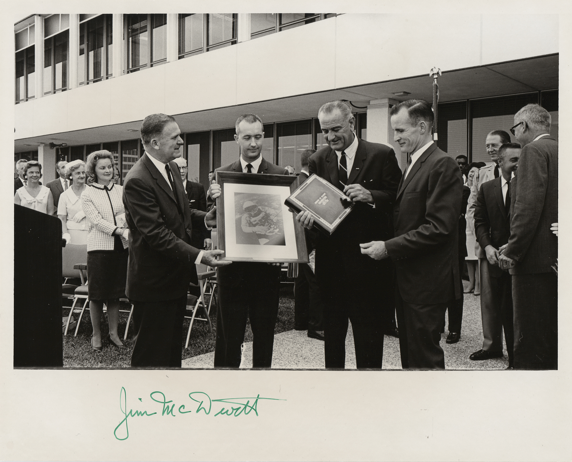Glossy 10 x 8 photo of Gemini 4 crewmen Ed White and Jim McDivitt meeting with President Lyndon B. Johnson, signed in the lower border in green felt tip, "Jim McDivitt." In fine condition, with some faint silvering to darker areas of the image. Accompanied by a certificate of authenticity from Novaspace's 'Jim McDivitt Garage Sale,' certifying that it is from his personal collection.