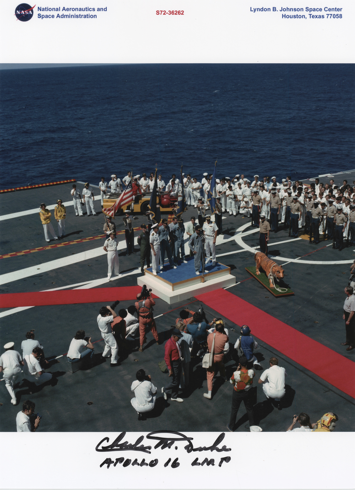 Color glossy 8 x 11 red-numbered NASA photo of the Apollo 16 crew aboard U.S.S. Ticonderoga recovery ship, signed in the lower border in black felt tip, "Charles M. Duke, Apollo 16 LMP." In very fine condition.