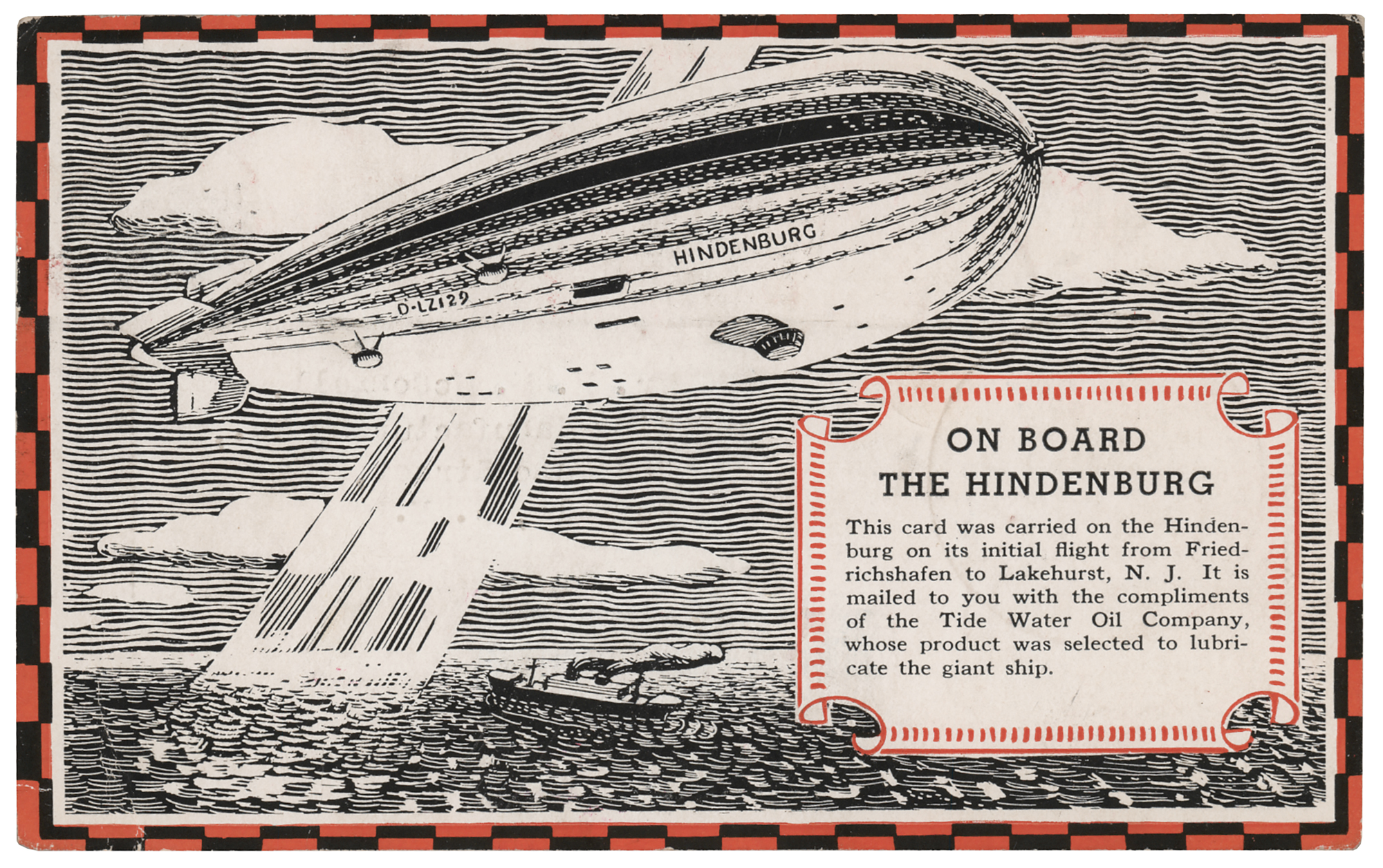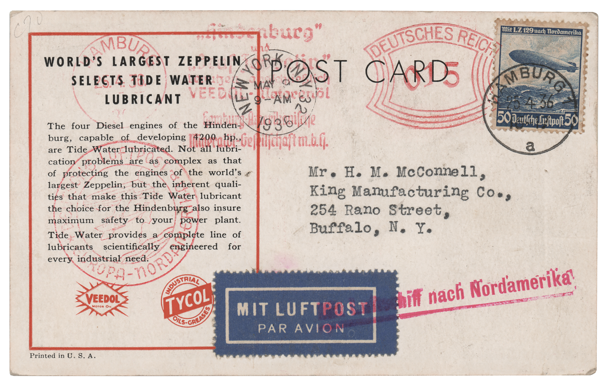 Flown 5.5 x 3.5 postcard advertising Veedol oil, featuring an image of the ill-fated Zeppelin on the front, with an inset block of text: "On Board the Hindenburg. This card was carried on the Hindenburg on its initial flight from Friedrichshafen to Lakehurst, N. J. It is mailed to you with the compliments of the Tide Water Oil Company, whose product was selected to lubricate the giant ship." The reverse bears an affixed German 50-pfennig airmail stamp postmarked at Hamburg, April 25, 1936, with an American cancellation to the lower right at New York, May 9, 1936. In fine condition, with trivial edgewear. The Hindenburg left from Frankfurt on May 6, 1936—exactly one year prior to the disaster—and landed in Lakehurst on May 9, the day of this New York postal cancellation.