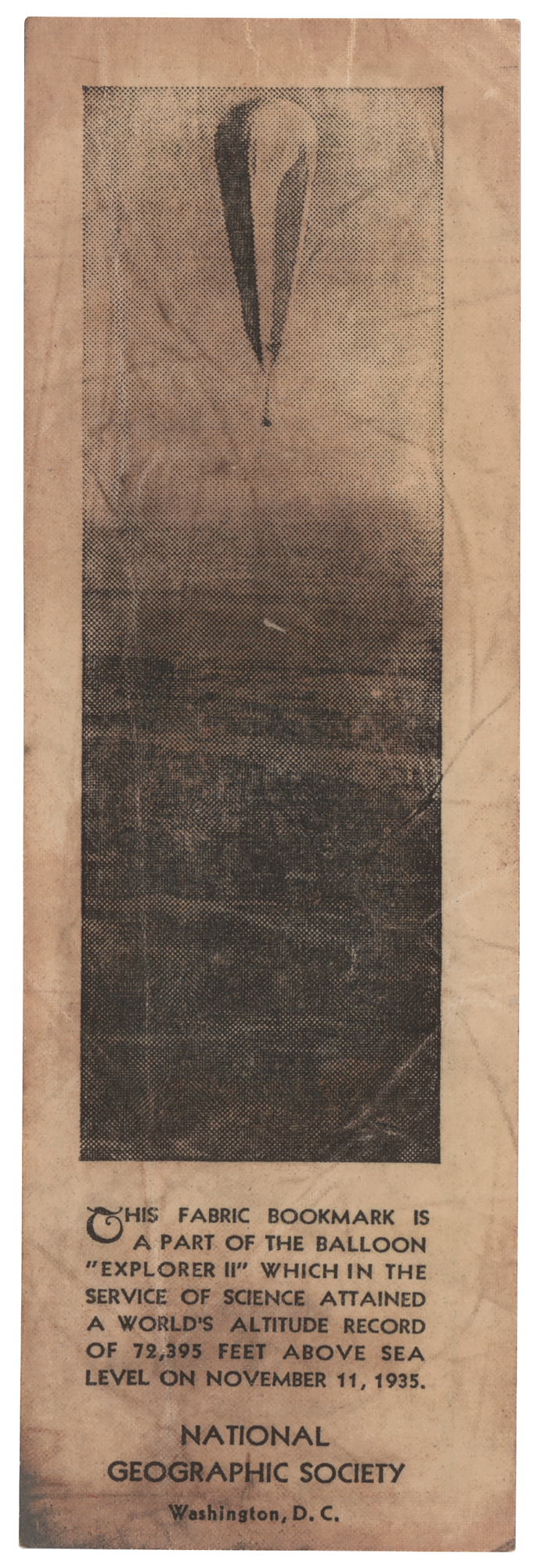 Bookmark made of flown fabric from the National Geographic Society-US Army Air Corps balloon Explorer II, 2.25 x 7, printed with an image of the balloon on one side and details of the flight on the reverse. The flight took place on November 11, 1935, and set an altitude record at a height of 72,395 feet. In very good condition, with overall creasing and staining.