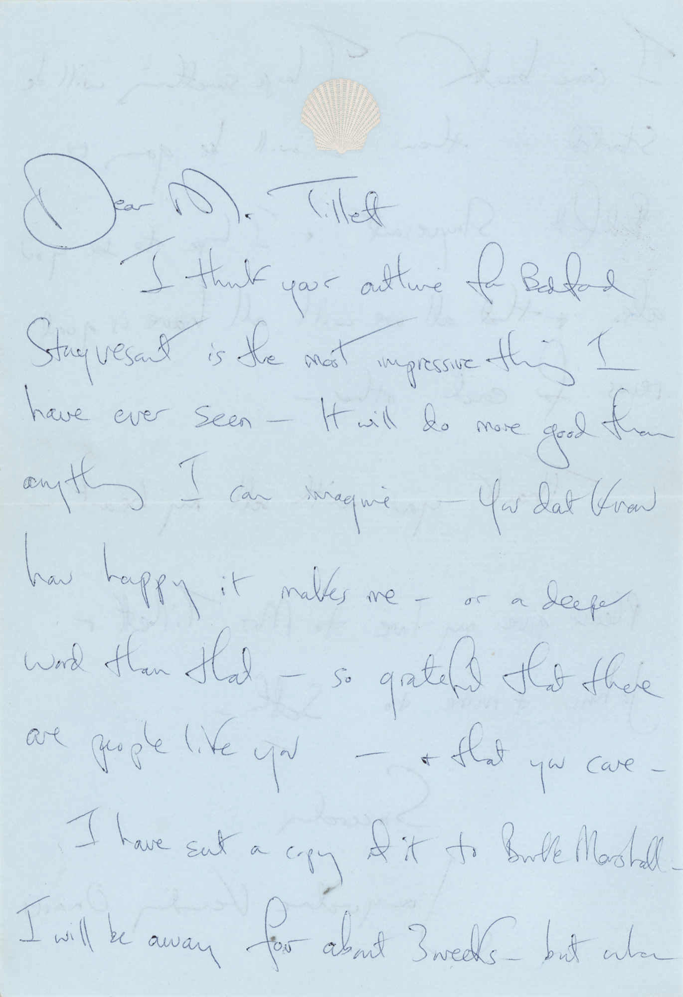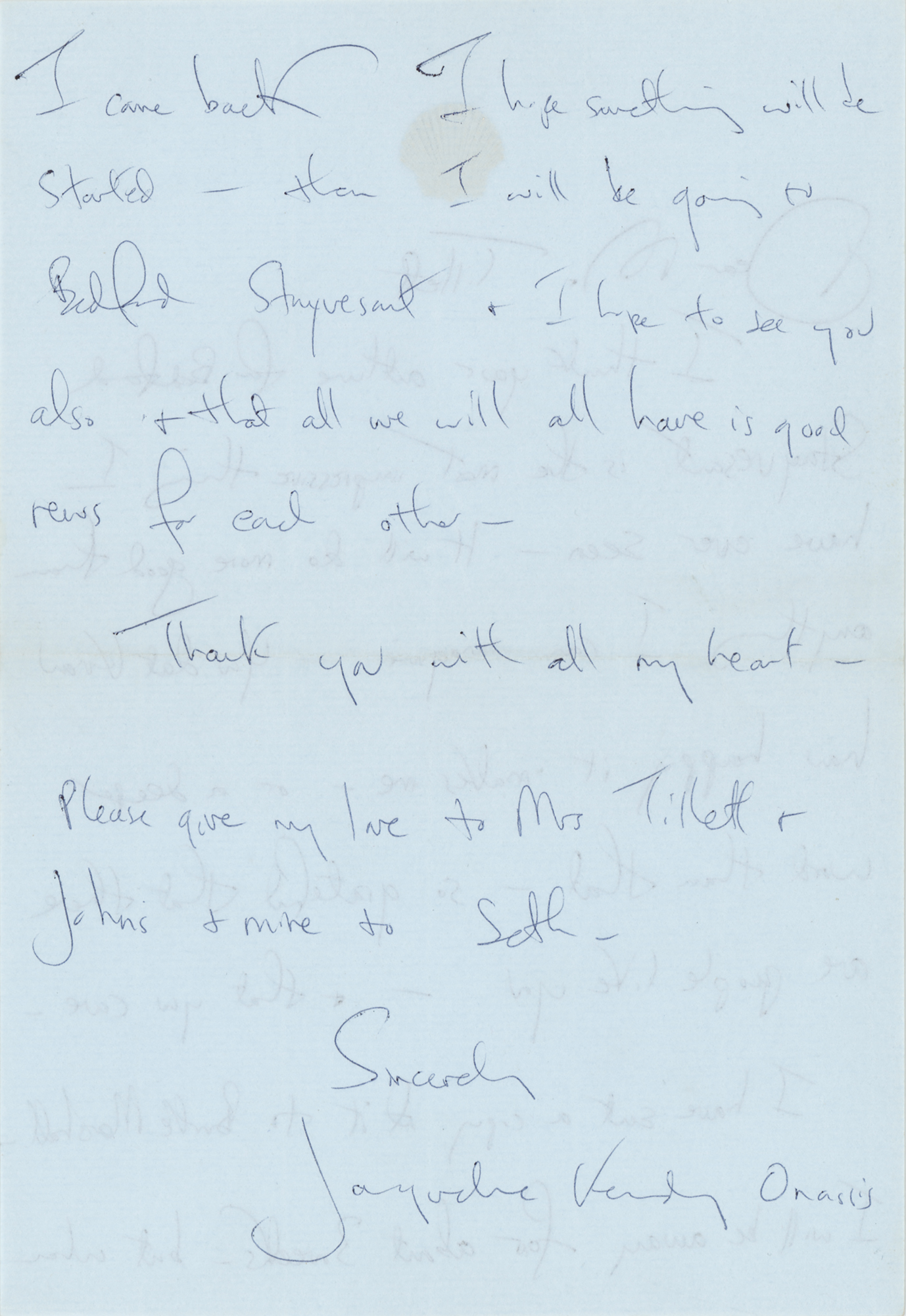 ALS signed “Jacqueline Kennedy Onassis,” two pages, 5.25 x 7.5, personal ‘white scallop shell’ letterhead, postmarked January 20, 1969. Handwritten letter to noted textile designer Leslie Tillett, in full: “I think your outline for Bedford Stuyvesant is the most impressive thing I have ever seen. It will do more good than anything I can imagine. You don’t know how happy it makes me — or a deeper word than that — so grateful that there are people like you, and that you care. I have sent a copy of it to Burke Marshall. I will be away for about 3 weeks, but when I come back I hope something will be started, then I will be going to Bedford Stuyvesant + I hope to see you also + that all we will all have is good news for each other. Thank you with all my heart. Please give my love to Mrs. Tillett + John’s + mine to Seth.” In fine condition. Accompanied by the original mailing envelope.