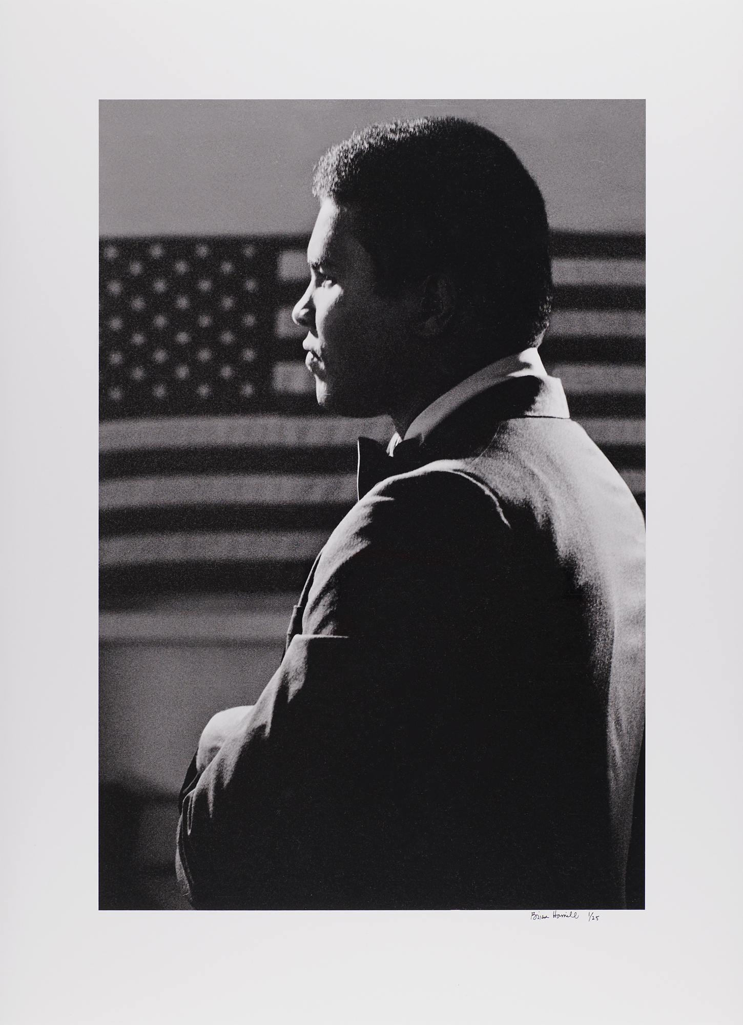 Beautiful limited edition 22.5 x 31 museum-quality archival pigment print of Muhammad Ali, numbered 1/25, depicting the boxer with folded arms in a half-length profile pose against an American flag background, an image originally taken by photographer Brian Hamill, who has signed the lower border in black ink. In very fine condition.