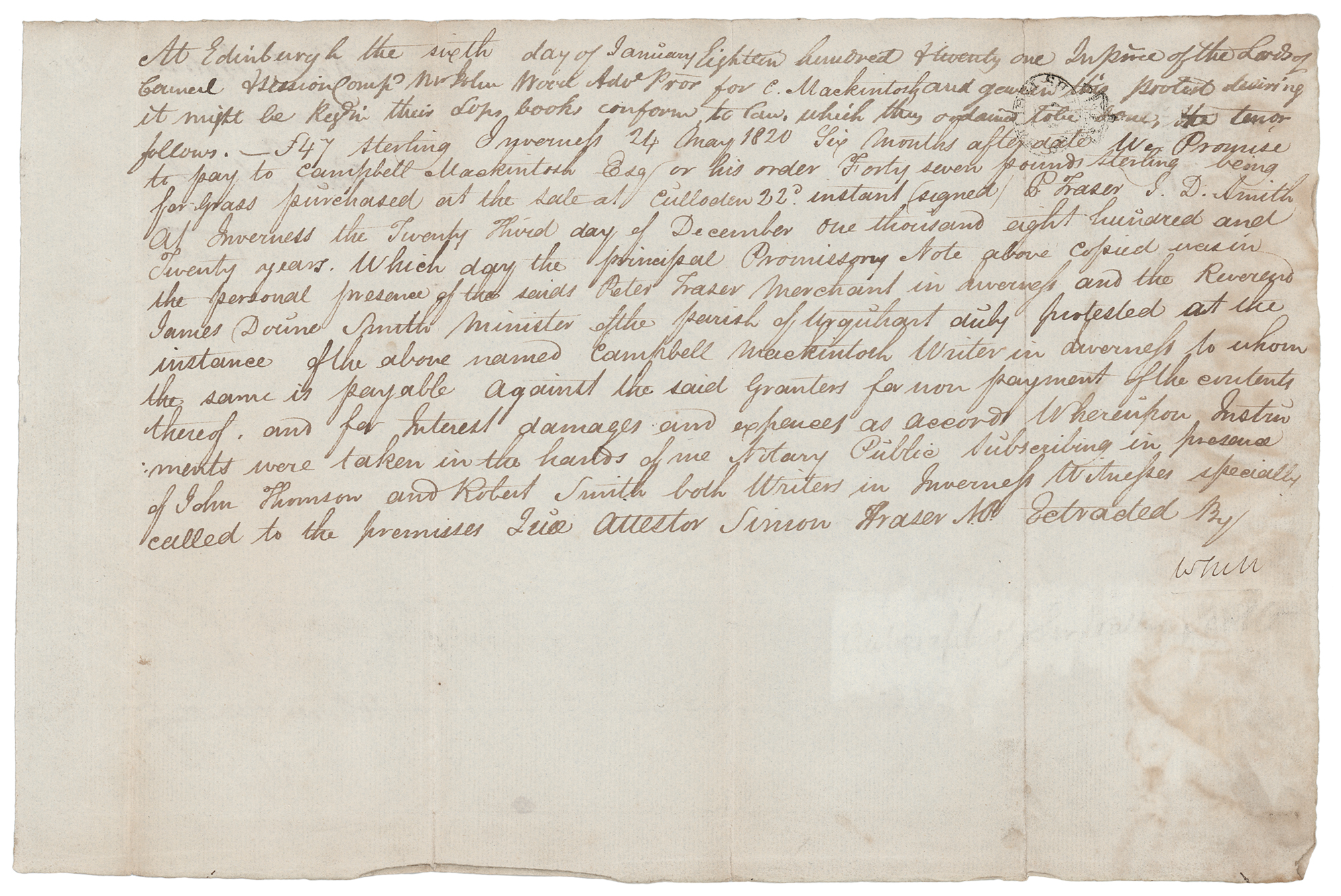 Manuscript DS, signed “W. Scott,” one page, 12.25 x 8.25, January 6, 1821. Registered protest filed at Edinburgh by Campbell Macintosh against Peter Fraser of Inverness and Reverend James D. Smith of Urquhart for nonpayment of a debt, signed at the conclusion in ink by Sir Walter Scott. Also endorsed on the reverse by Scott, "[McQueen] Mackintosh, W.S." In very good to fine condition, with light staining along the right edge, touching but not adversely affecting the signature.