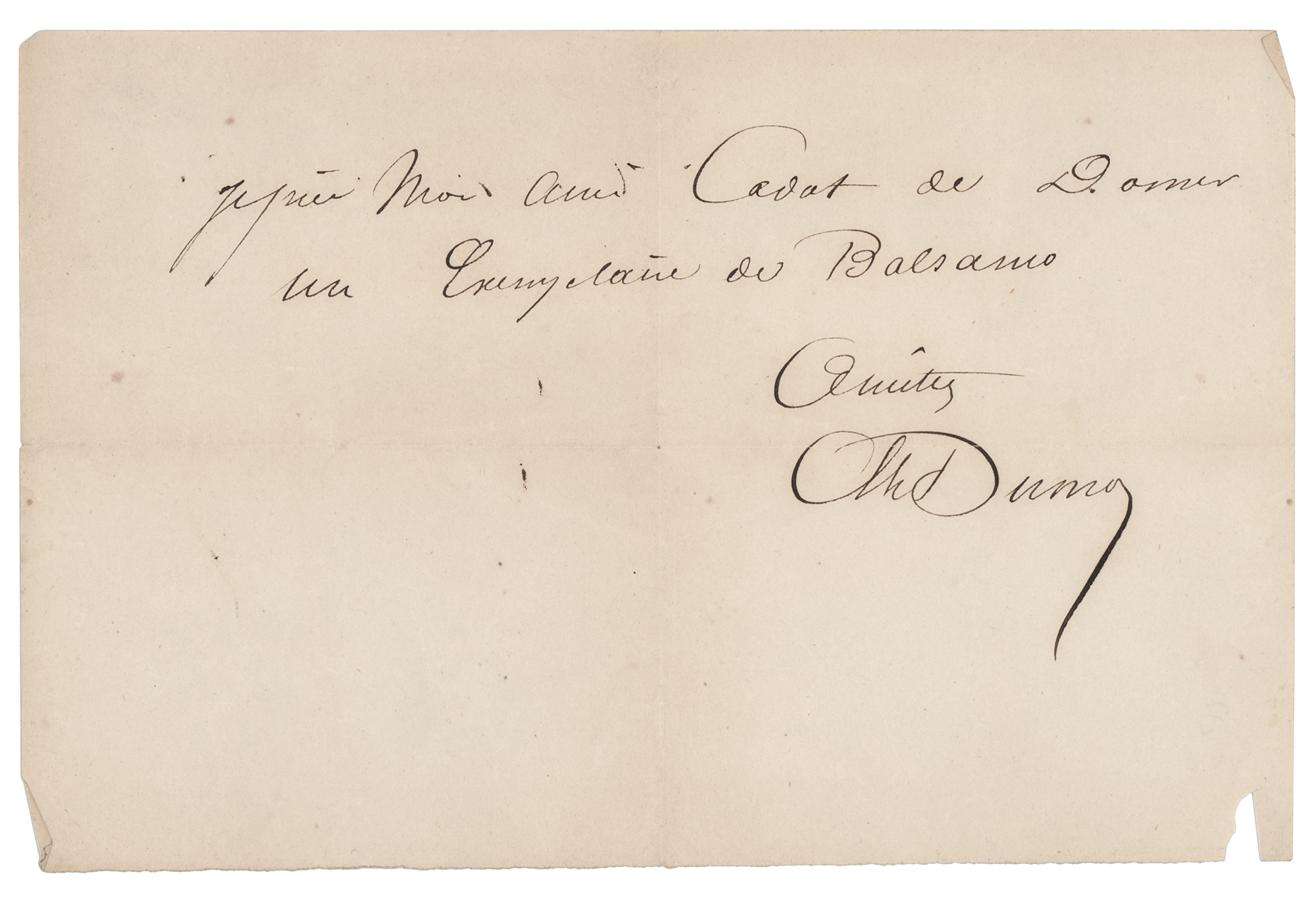 Prolific French writer (1802–1870) known for such classics as The Count of Monte Cristo and The Three Musketeers. ANS in French, signed “Ale. Dumas,” one page, 8 x 5.25, no date. Untranslated handwritten note by the famed French author. In very good to fine condition, with light intersecting folds, and minor paper loss to the bottom edge.
