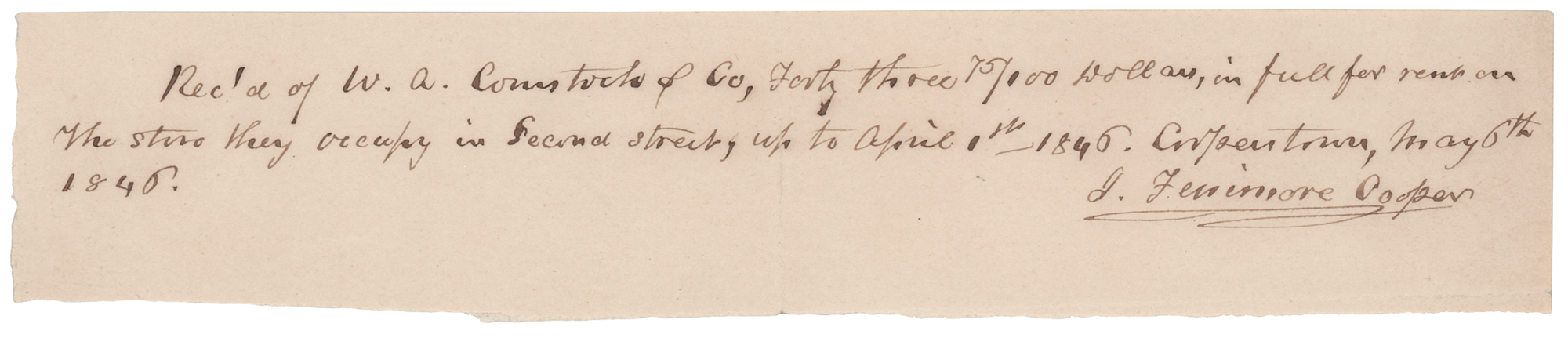 ADS, signed "J. Fenimore Cooper," one page, 7.75 x 1.5, May 6, 1846. Handwritten receipt, in full: "Rec'd of W. A. Comstock & Co., Forty three 75/100 dollars, in full for rent on the store they occupy in Second Street, up to April 1st 1846. Cooperstown." In fine condition.