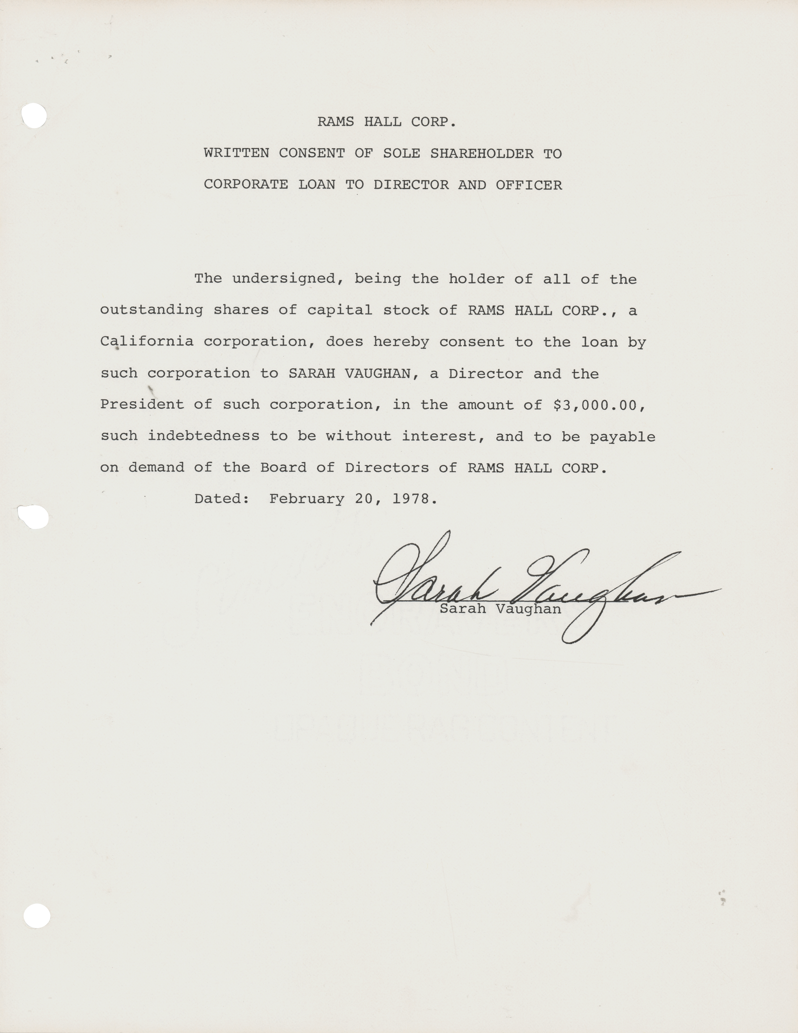 DS, one page, 8.5 x 11, February 20, 1978. Rams Hall Corp. shareholder document for "the loan by such corporation to Sarah Vaughan, a Director and the President of such corporation, in the amount of $3,000." In fine condition. Accompanied by an unsigned promissory note for the loan.