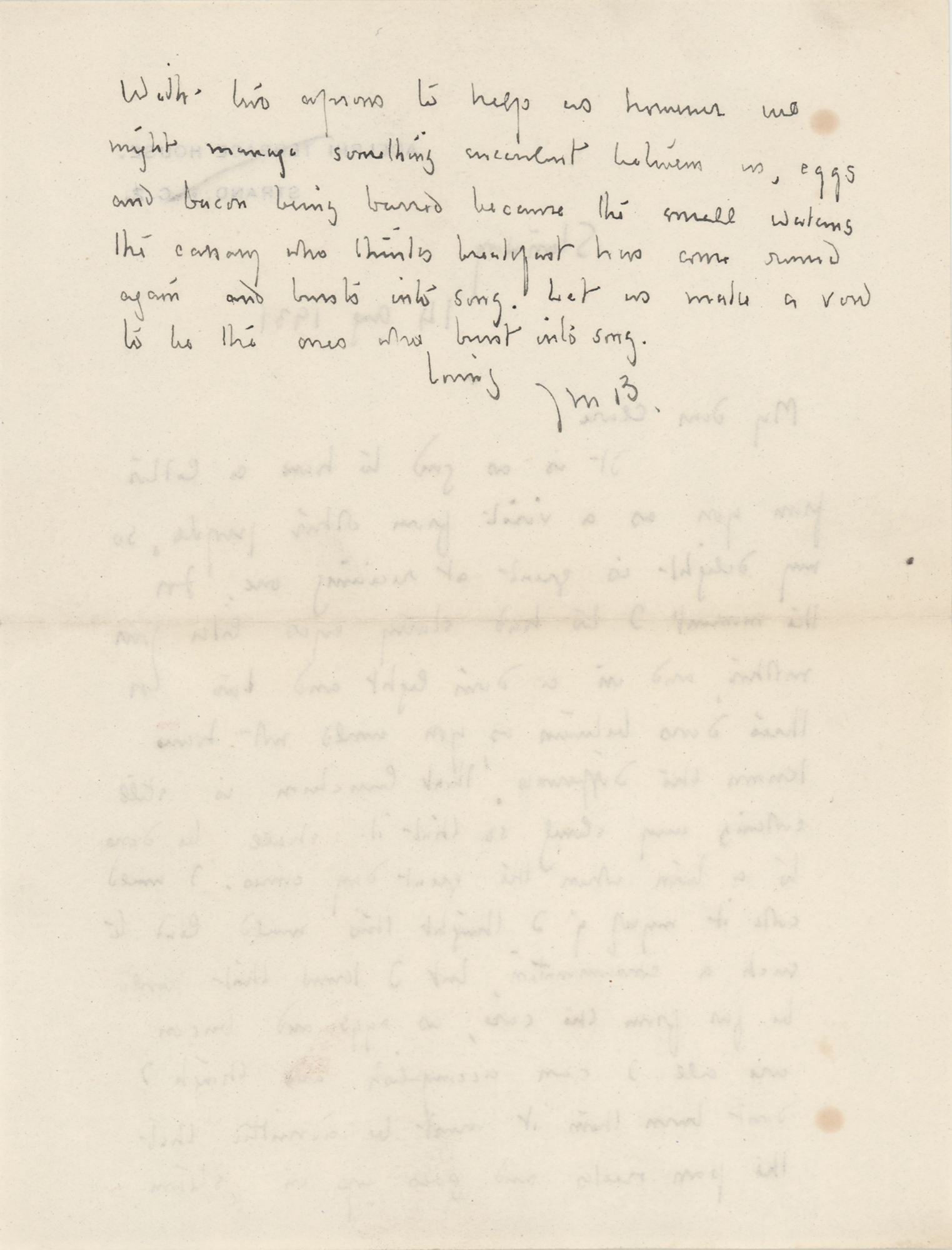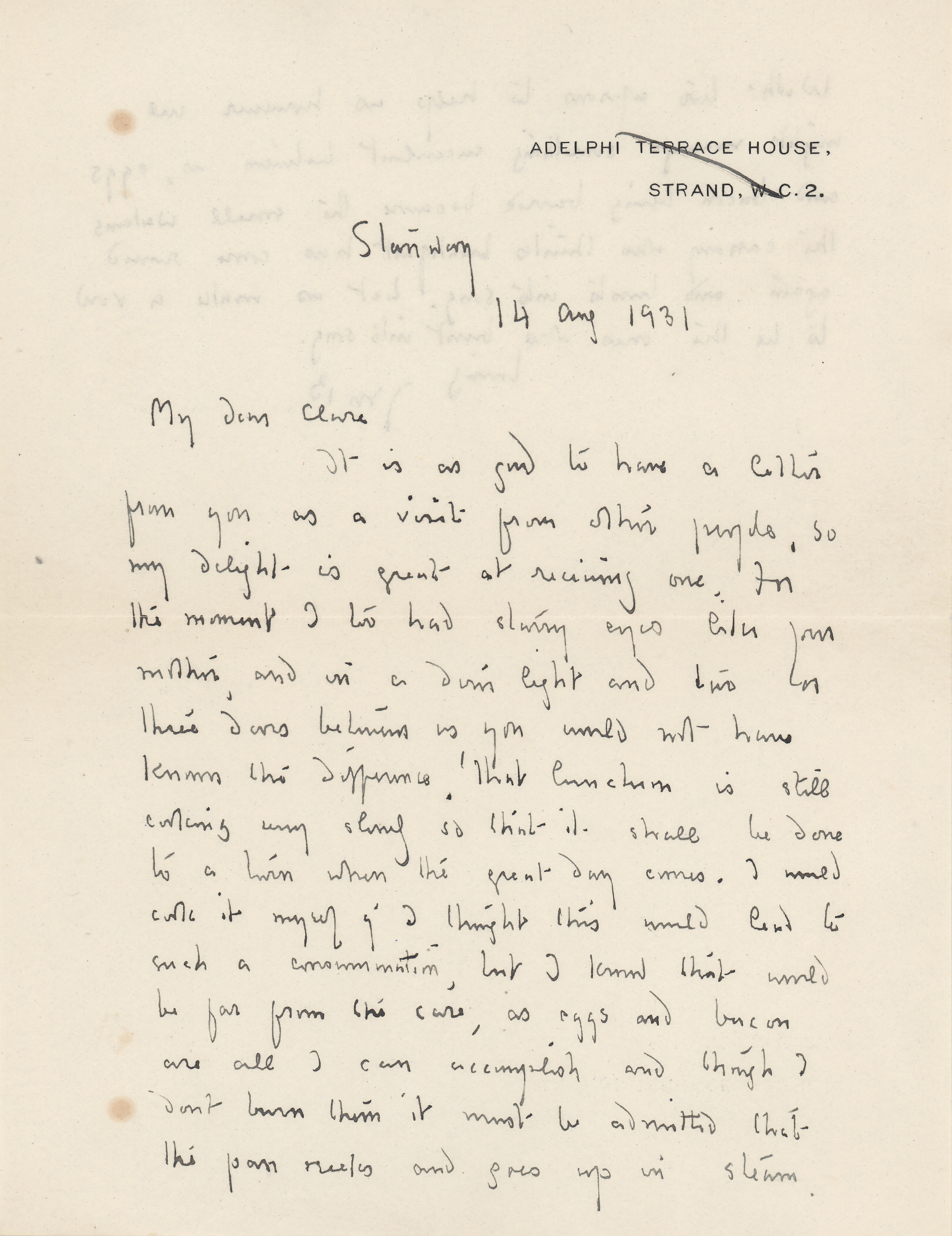Scottish author and dramatist (1860-1937) best known for the classic children's play Peter Pan. ALS signed “J.M.B.,” one page both sides, 5.5 x 7, Adelphi Terrace House letterhead, August 14, 1931. Handwritten letter to Clare Mackail, in part: "It is as good to have a letter from you as a visit from other people, so my delight is great at receiving one…That luncheon…I would work it myself…eggs and bacon are all I can accomplish." In fine condition, with two trivial spots of toning. Accompanied by the original mailing envelope, addressed in Barrie's own hand.