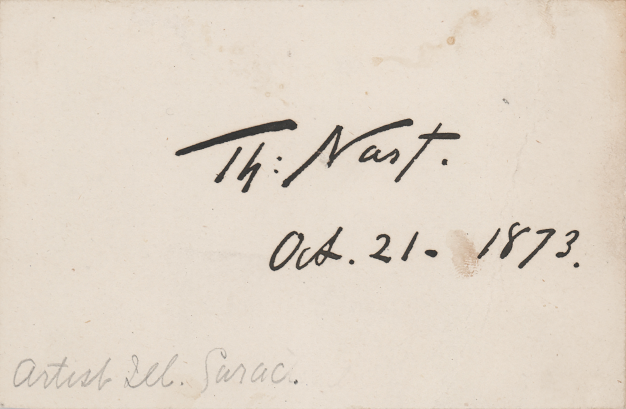 Influential early American political cartoonist and illustrator (1840–1902) considered to be the 'Father of the American Cartoon.' Bold ink signature, "Th: Nast,” on an off-white 3.5 x 2.25 card. In fine condition, with a tiny stain touching the date.