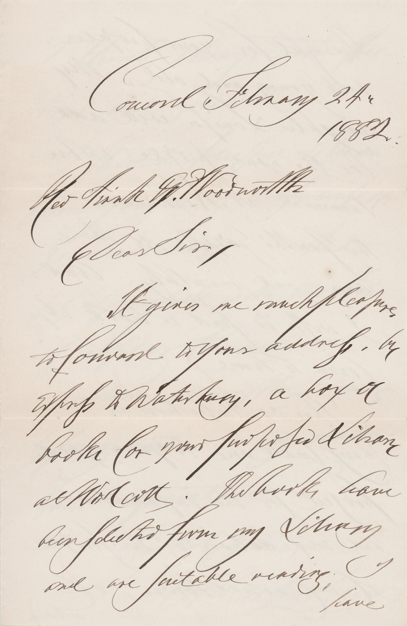Three items: a pencil signature, "L. M. Alcott, Concord, Mass.," on an off-white slip dated 1869; an ink signature, "Very truly yours, A. Bronson Alcott," on an off-white slip; and an ALS signed "A. Bronson Alcott," three pages on two adjoining sheets, February 24, 1882, in part: "The books have been solicited from my Library and are suitable reading, I have thought, for your people, both young and old. My daughter Louisa will add for the young peoples entertainment St. Nicholas and the Youth's Gazette, as these come out monthly." In overall fine condition, with a short tear (and associated creasing) to the bottom edge of the Louisa slip.