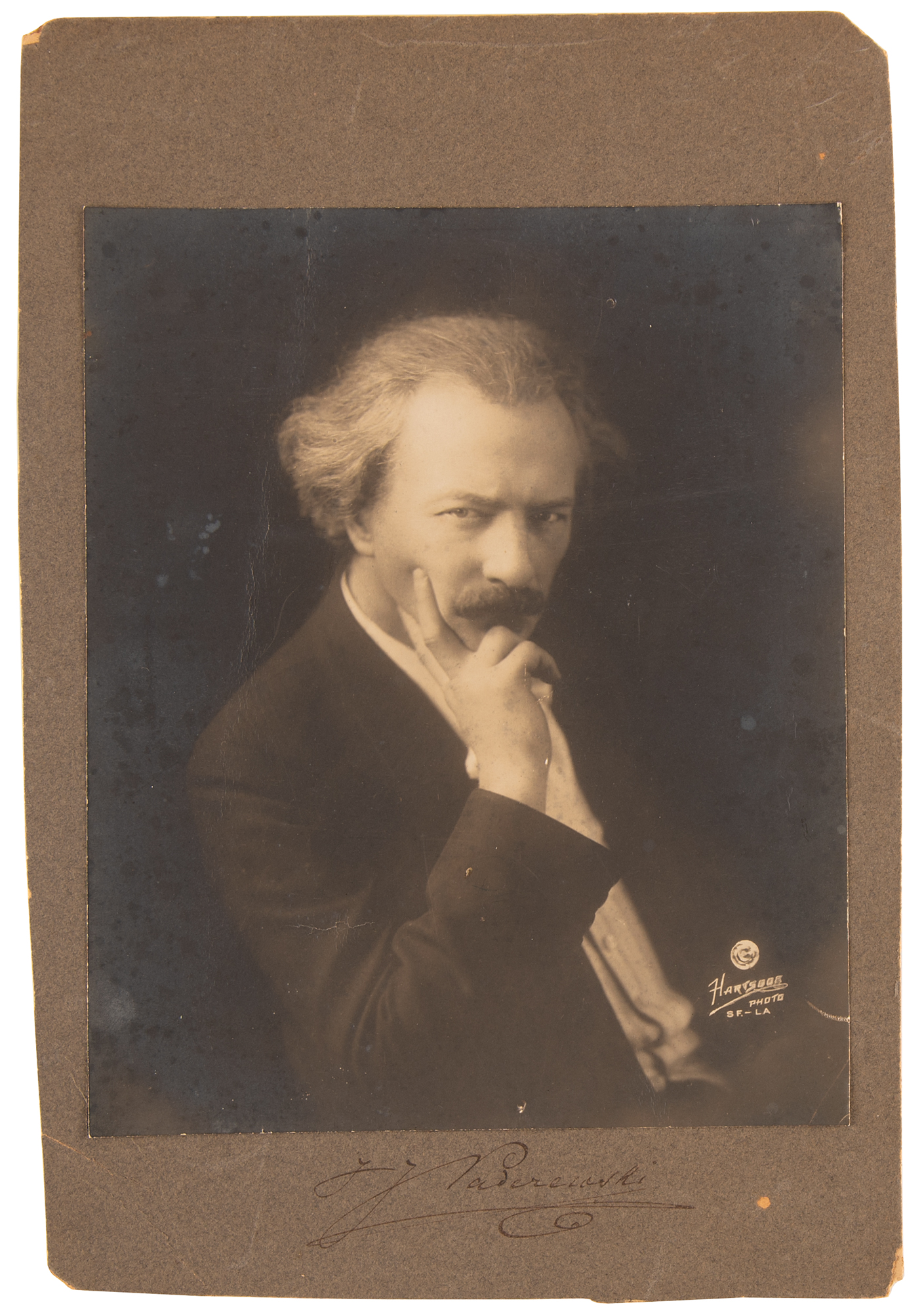 Polish pianist, composer, and politician (1860–1941) whose abounding talent and personal magnetism made him one of the most popular virtuosi of all time. Vintage matte-finish 7.5 x 9.5 Hartsook Studio portrait photo of Paderewski in a powerful half-length pose, affixed to the original 8.75 x 13.25 mount, which is signed in fountain pen, "I. J. Paderewski.” The mount reverse is annotated, “Bought at the concert and address delivered Paderewski for the benefit of Starving Poland, November 1915.” In very good to fine condition, with speckled silvering to the image, and creasing and corner loss to the trimmed mount.