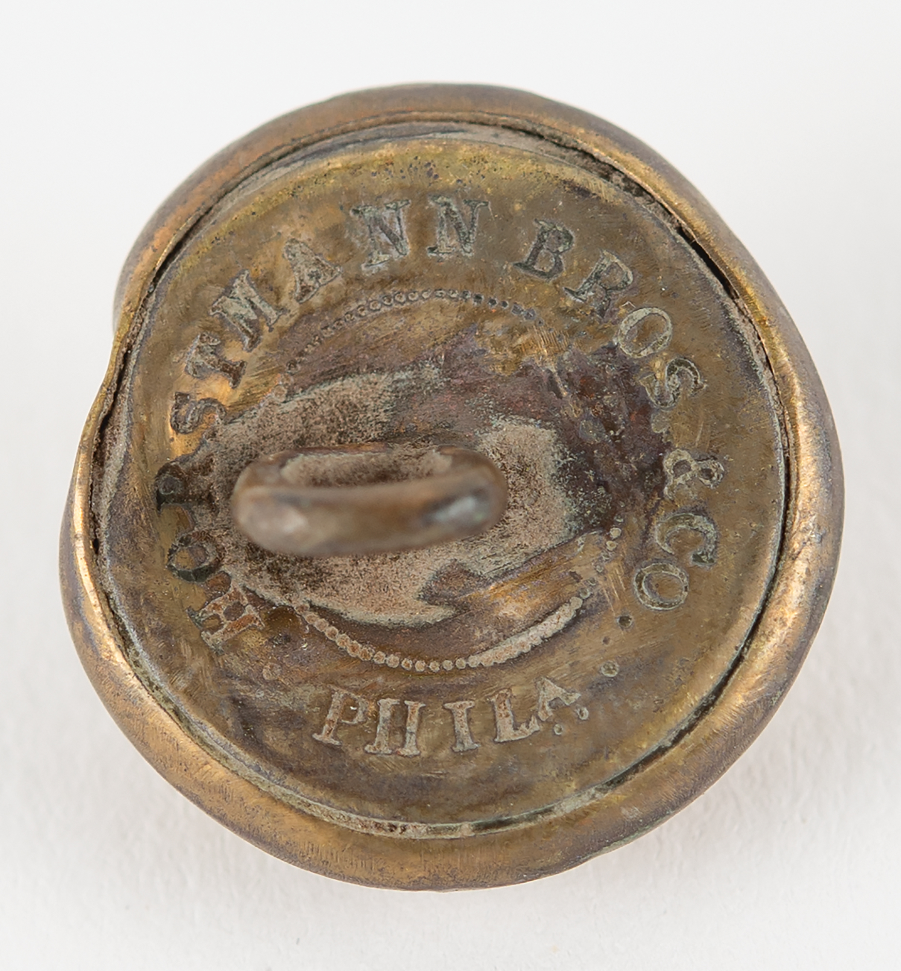 Brass U.S. military eagle button attributed to the Battle of the Little Bighorn (Custer’s Last Stand), fought June 25–26, 1876, along the Little Bighorn River in Montana Territory. The clash between U.S. Army forces and Lakota Sioux, Northern Cheyenne, and Arapaho warriors ended in a decisive Native American victory and remains the most significant battle of the Great Sioux War of 1876. This accouterment, .75˝ in diameter, is attested as deriving from the uniform of a soldier or other equipment standard in the U.S. Seventh Cavalry. The reverse bears the backmark of "Horstmann, Bros." of Philadelphia, Pennsylvania. In fine, found condition.