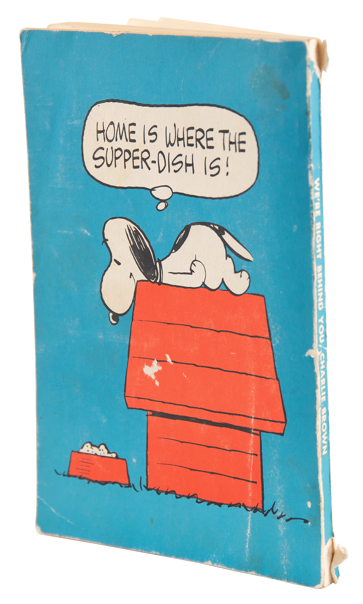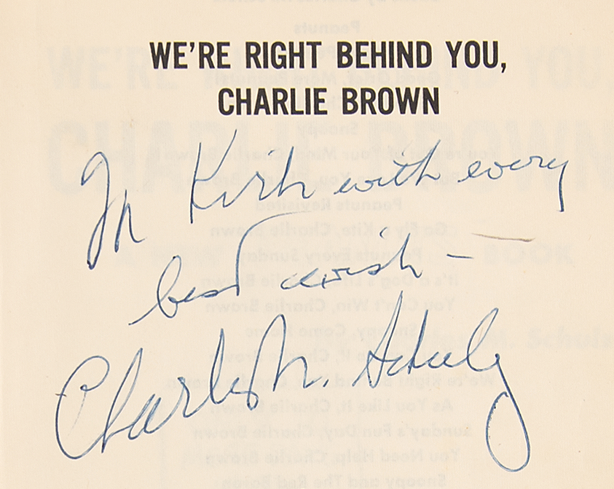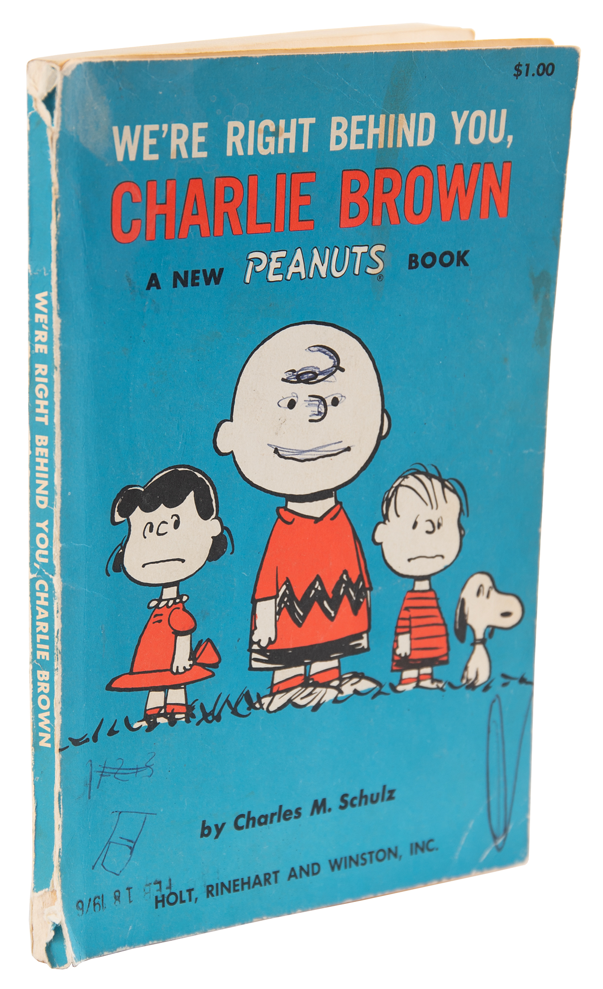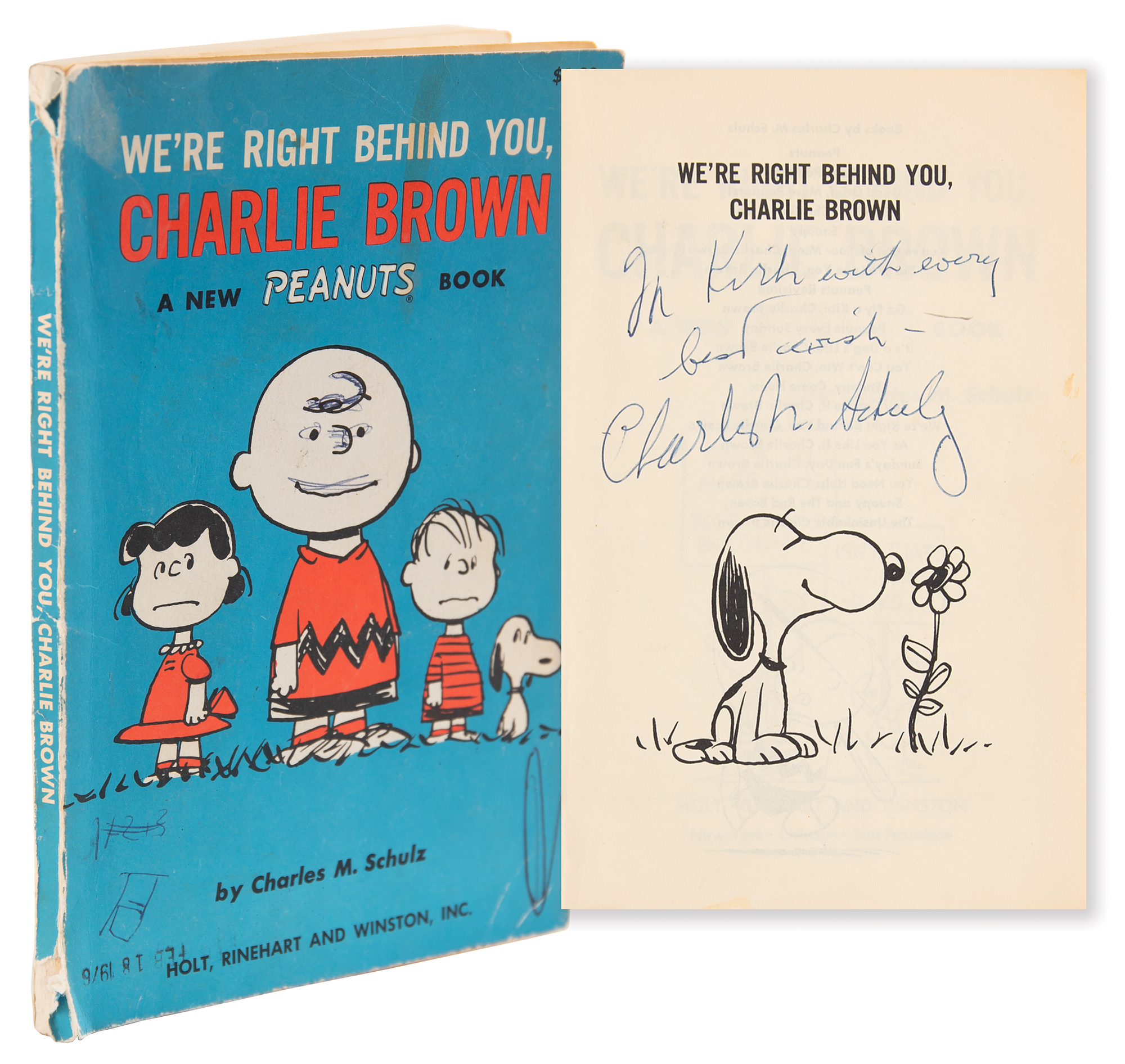 Signed book: We're Right Behind You, Charlie Brown. Fourth printing. NY: Holt, Rinehart and Winston, 1967. Paperback, 5.25 x 8. Signed and inscribed on the title page in blue ballpoint, "For Kirk, with every best wish—Charles M. Schulz." He also adds a full-page portrait sketch of Charlie Brown inside the front wrapper, signed below in blue ballpoint, "Schulz." In fine condition, with tears to the spine and unrelated scribbles on the cover, in no way affecting the sketches within.
