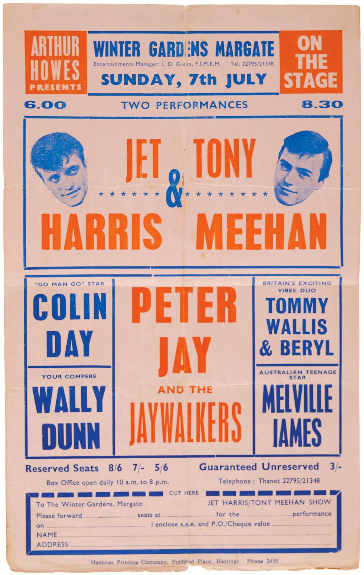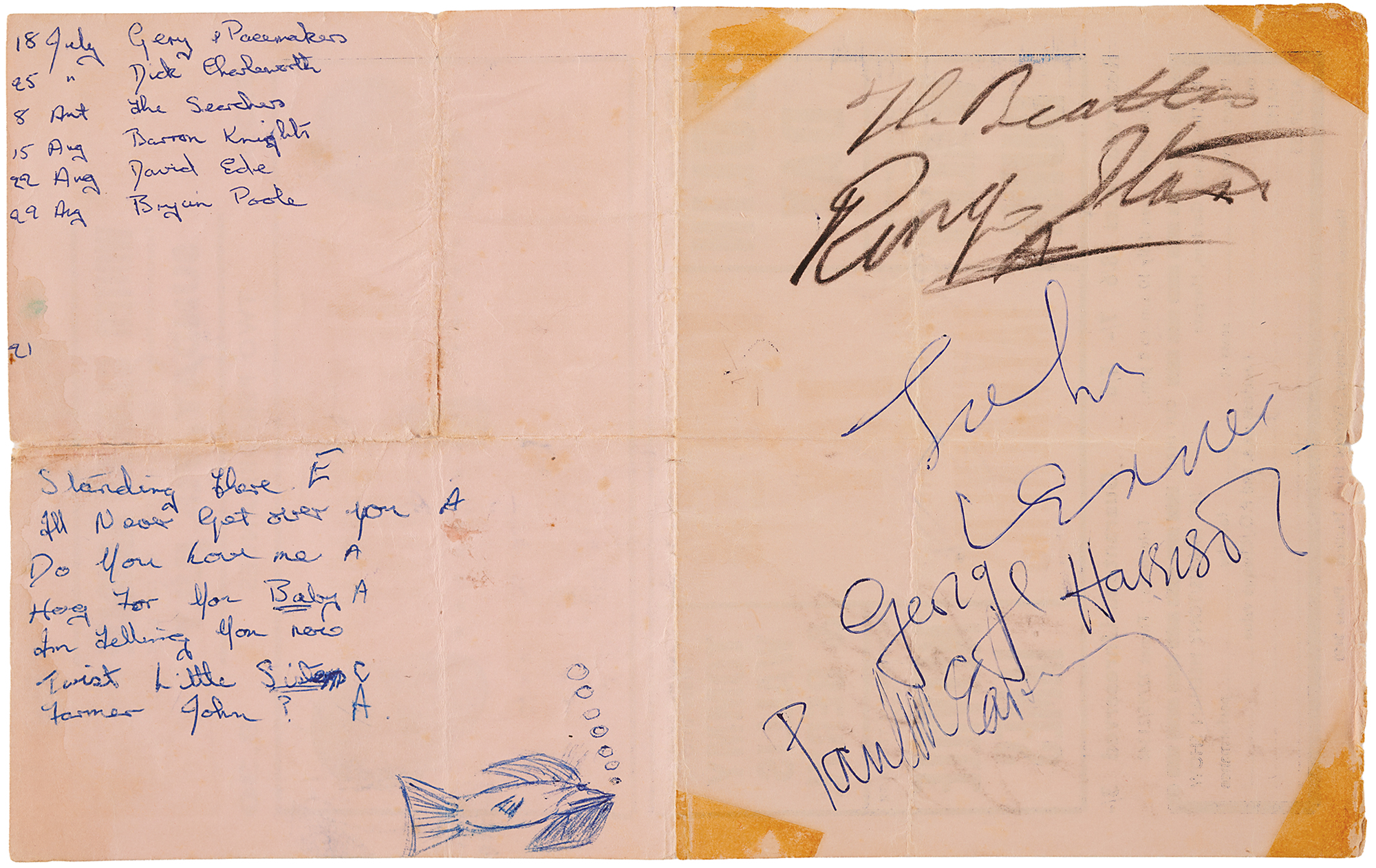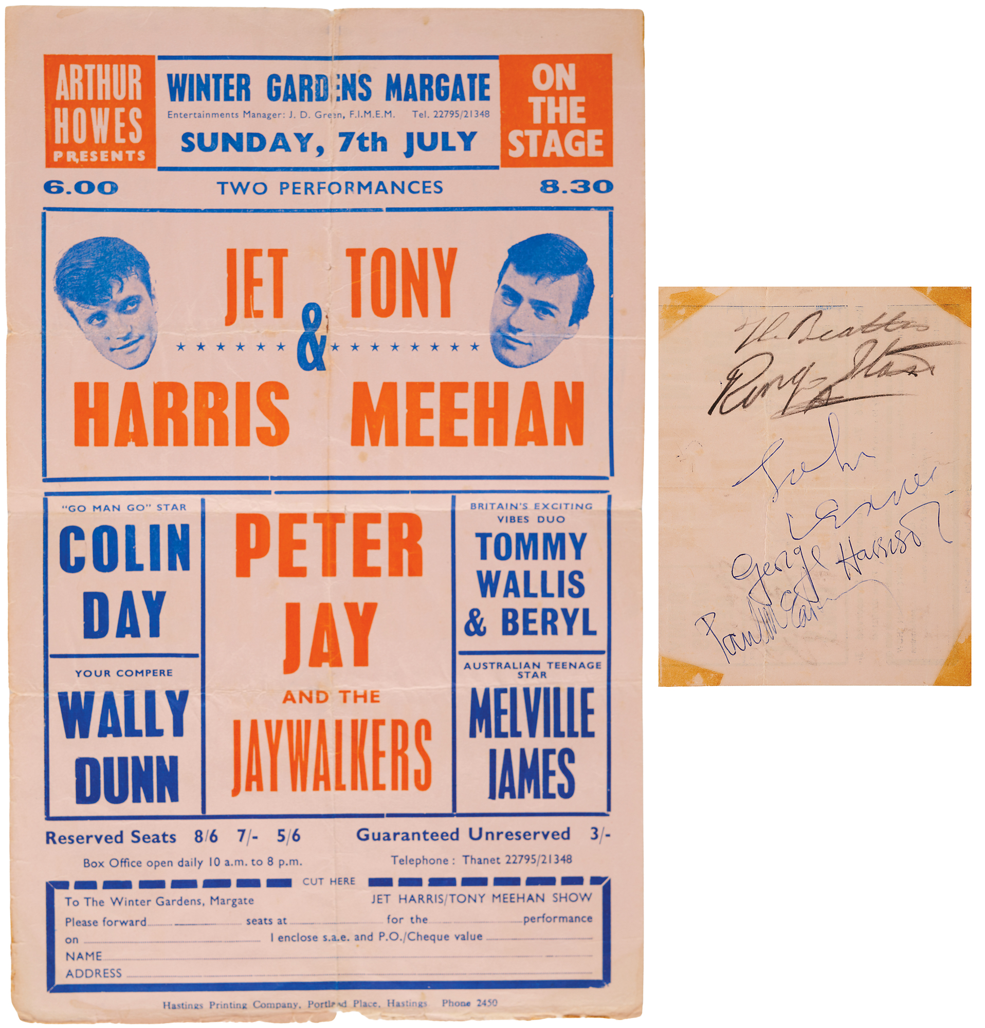 Original vintage 5.5 x 8.75 handbill for a concert at the Winter Gardens in Margate, England on July 7, 1963, featuring musical performances by Jet Harris, Tony Meehan, and Peter Jay and the Jaywalkers, signed on the reverse by the Beatles, with John Lennon, Paul McCartney, and George Harrison signing in ballpoint, and Ringo Starr signing in pencil and adding “The Beatles.” The adjacent side of the handbill bears ownership notations. The consignor notes that the autographs were obtained at the venue when the Beatles performed a short residency there between July 8-13, 1963. In very good condition, with light creasing, general handling wear, and old tape stains to the corners. Accompanied by a certificate of authenticity from Tracks and a letter of provenance from the niece of the original recipient: “My auntie…lived in Margate, Kent. She was actually dating someone in a band at the time, and he used to take her to all the bands playing at the Winter Gardens in Margate. She went to see the Beatles in 63, and got their autographs.”