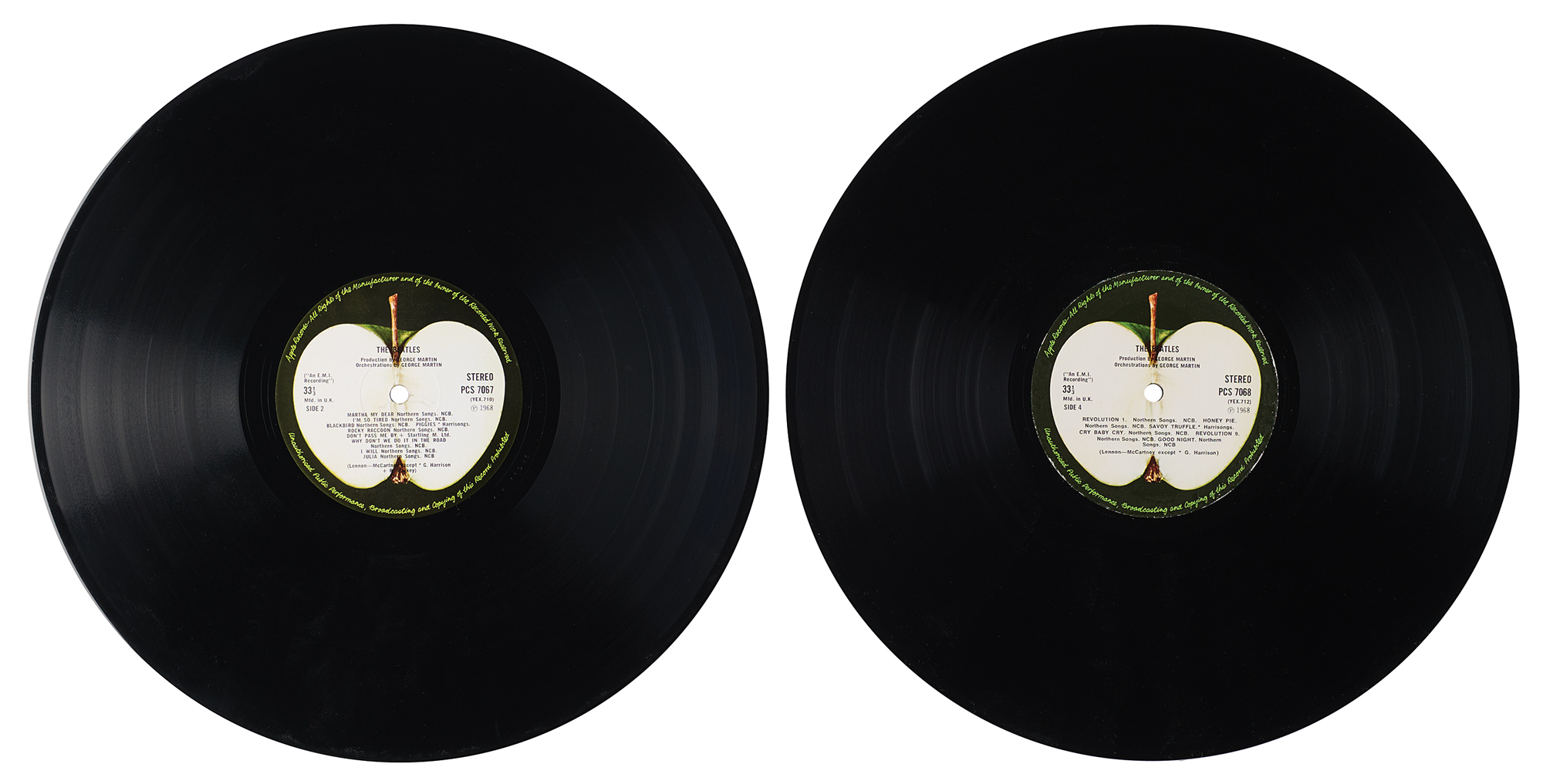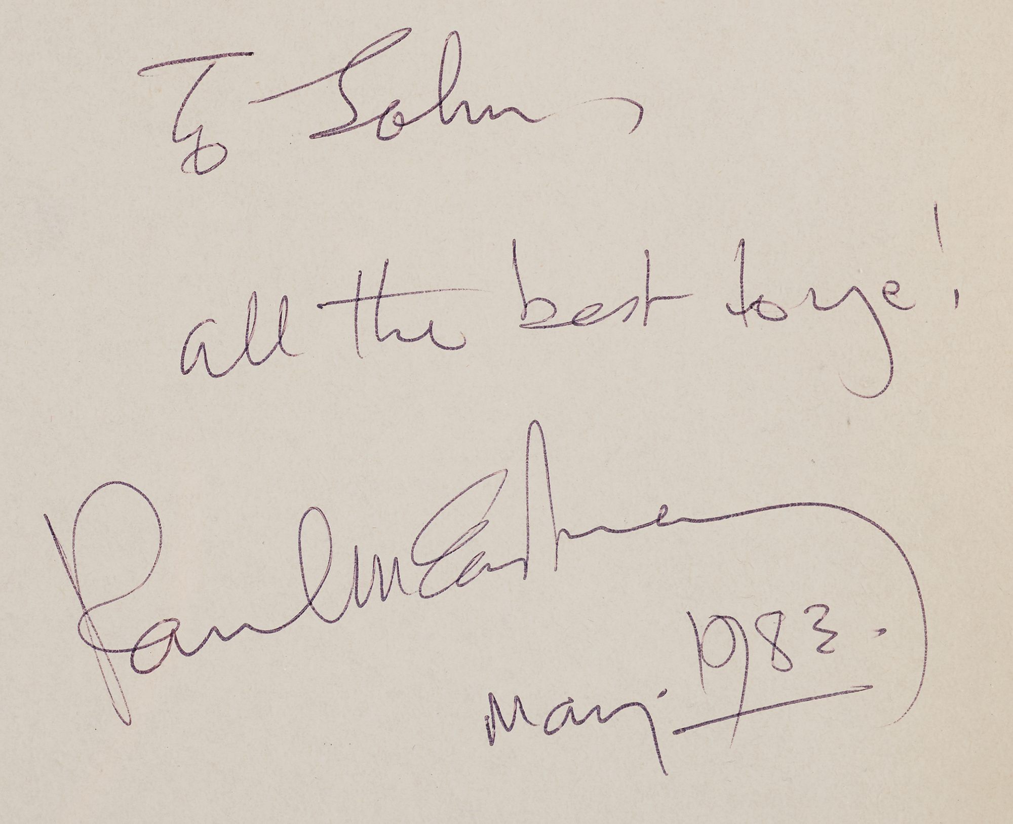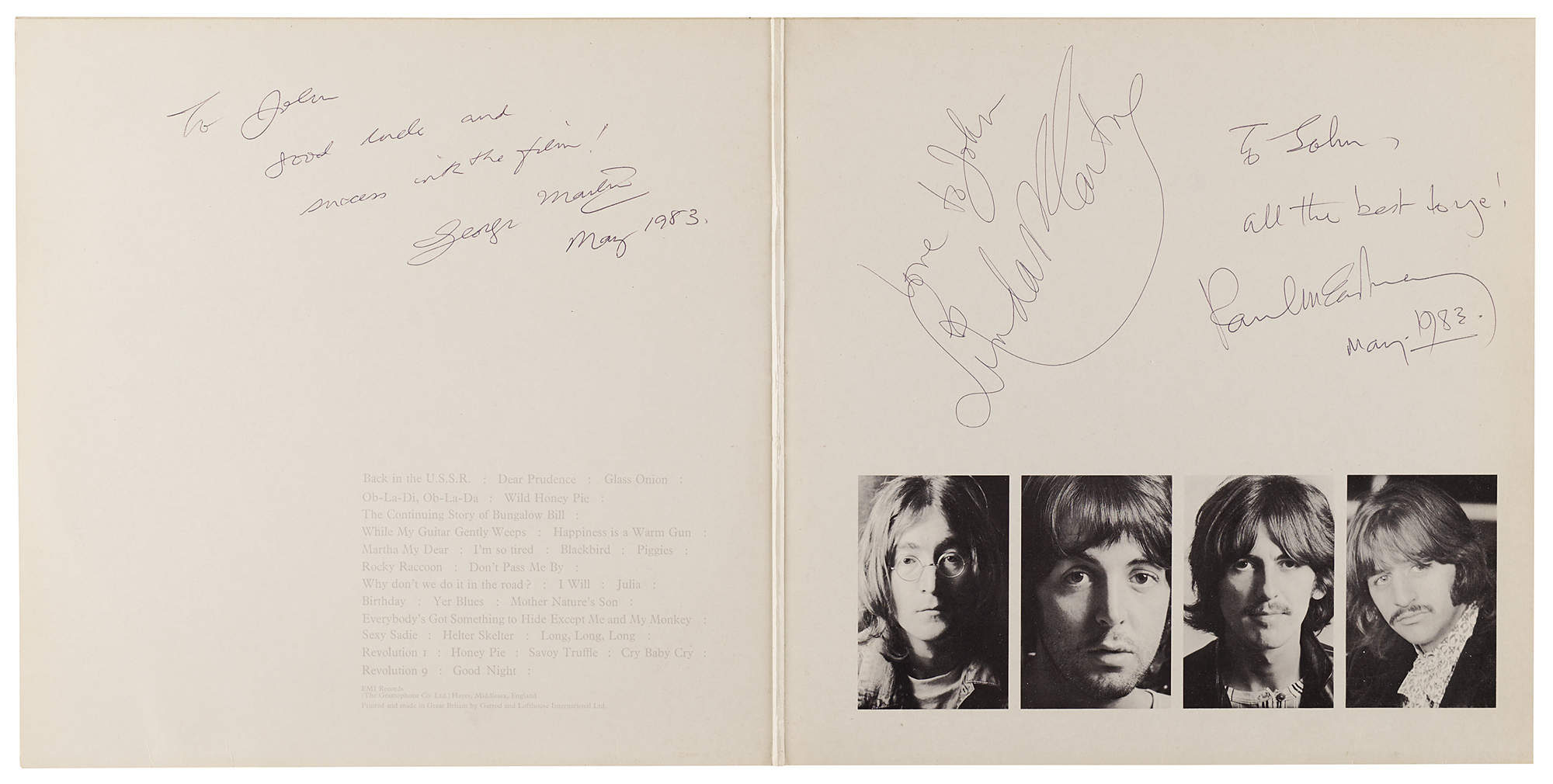 Early 1980s UK pressing of the Beatles’ self-titled 1968 album, known as ‘The White Album,’ signed and inscribed on the inner gatefold in black ballpoint, “To John, all the best to ye! Paul McCartney, May, 1983,” “Love to John, Linda McCartney,” and “To John, Good luck and success with the film! George Martin, May 1983.” The consignor notes that the autographs were obtained at Elstree Studios in Borehamwood, England, in May 1983, while McCartney was filming scenes for his 1984 film, Give My Regards to Broad Street. In fine condition. The records are included, as are the portrait photos and poster. Accompanied by a certificate of authenticity from Tracks and a letter from the original recipient, which reads: “To confirm I worked in the Camera department on the feature film ‘Give My Regards to Broad Street,’ which was produced in 1983/84 at Elstree Studios, Borehamwood. During the filming period, this album was signed by Paul McCartney, Linda McCartney, and George Martin.”
