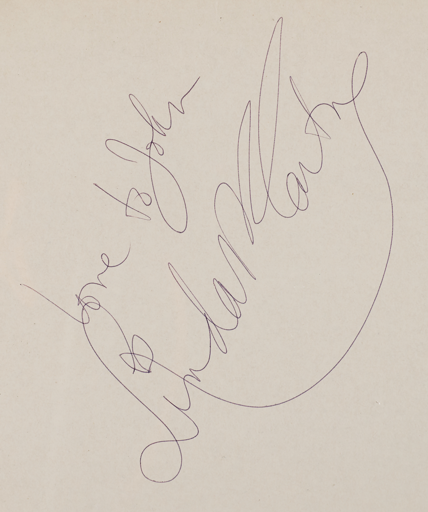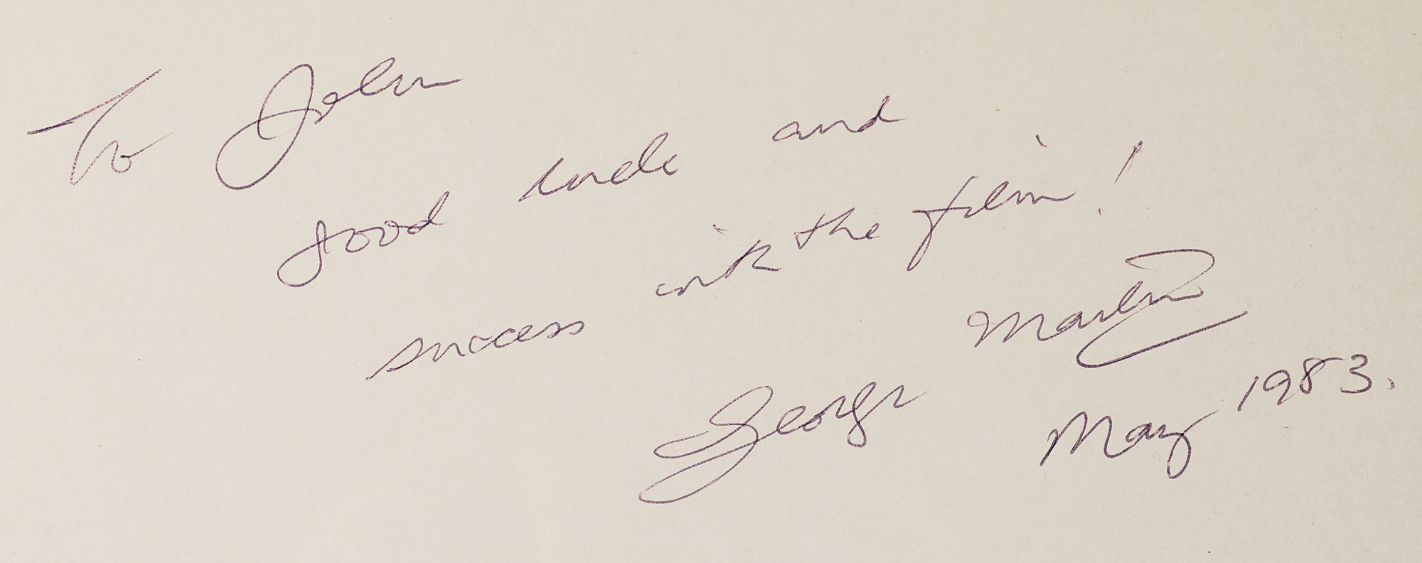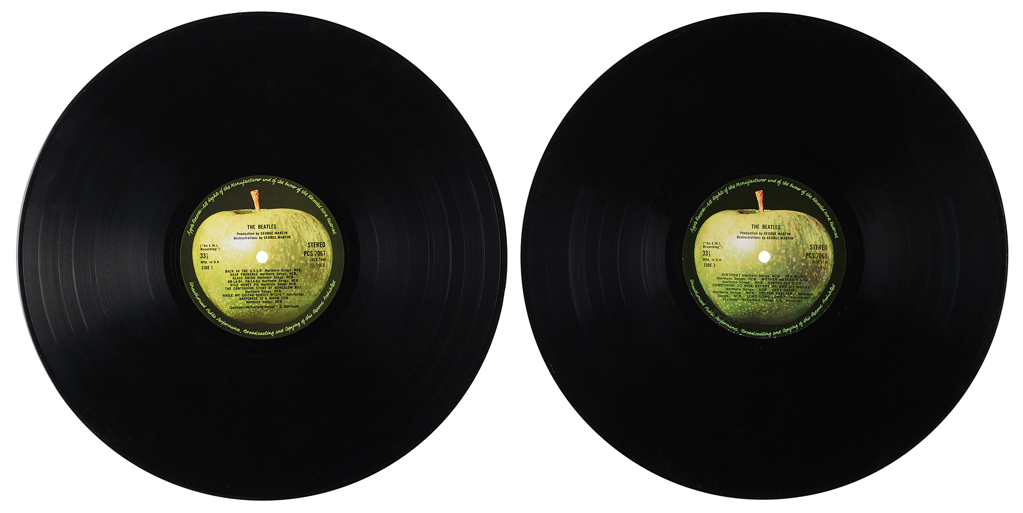 Early 1980s UK pressing of the Beatles’ self-titled 1968 album, known as ‘The White Album,’ signed and inscribed on the inner gatefold in black ballpoint, “To John, all the best to ye! Paul McCartney, May, 1983,” “Love to John, Linda McCartney,” and “To John, Good luck and success with the film! George Martin, May 1983.” The consignor notes that the autographs were obtained at Elstree Studios in Borehamwood, England, in May 1983, while McCartney was filming scenes for his 1984 film, Give My Regards to Broad Street. In fine condition. The records are included, as are the portrait photos and poster. Accompanied by a certificate of authenticity from Tracks and a letter from the original recipient, which reads: “To confirm I worked in the Camera department on the feature film ‘Give My Regards to Broad Street,’ which was produced in 1983/84 at Elstree Studios, Borehamwood. During the filming period, this album was signed by Paul McCartney, Linda McCartney, and George Martin.”