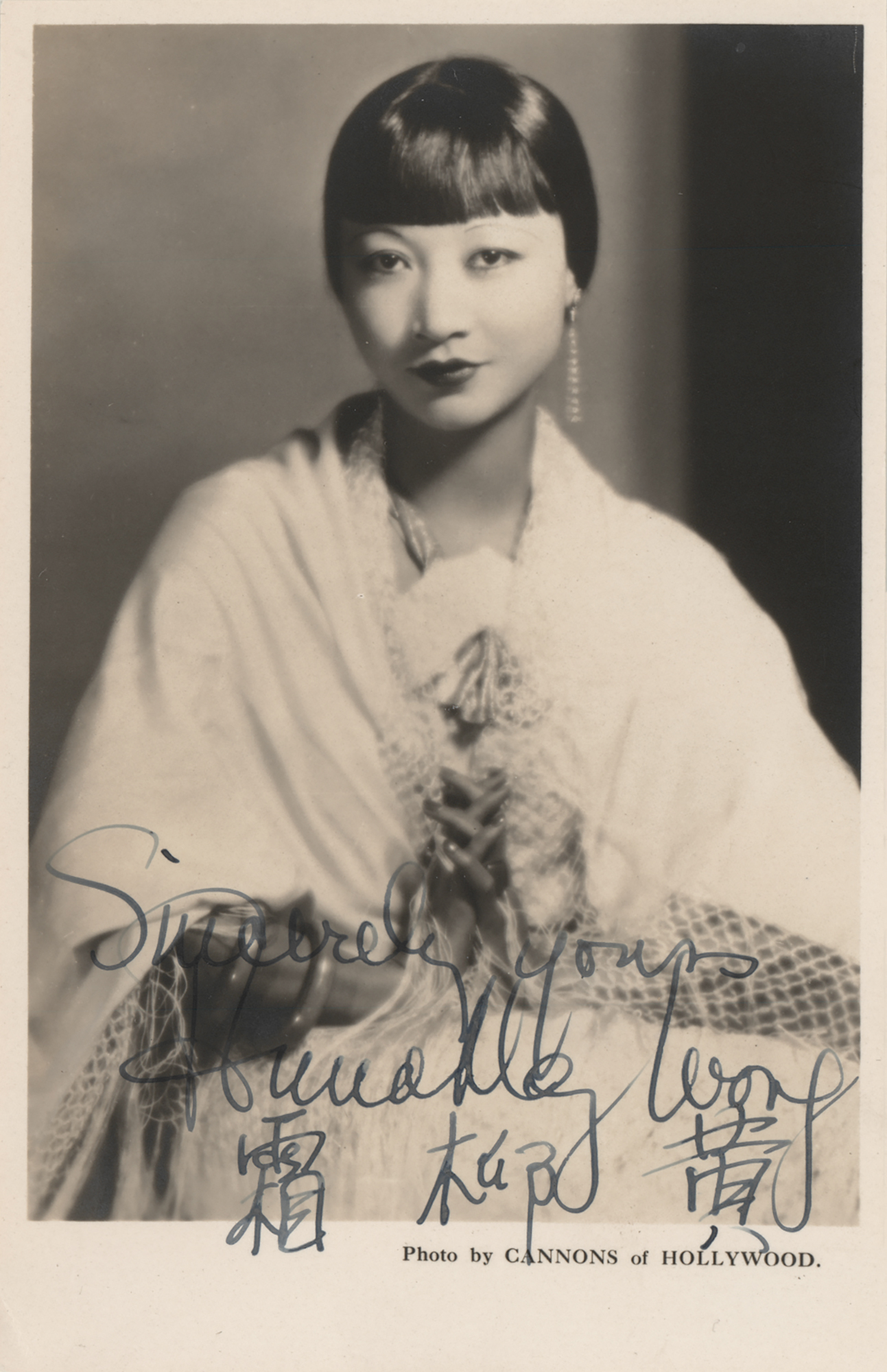 Vintage matte-finish 3.5 x 5.25 postcard photo of the pioneering Chinese-American actress in a lovely half-length pose, signed in fountain pen in English and Chinese, "Sincerely yours, Anna May Wong." In fine condition.