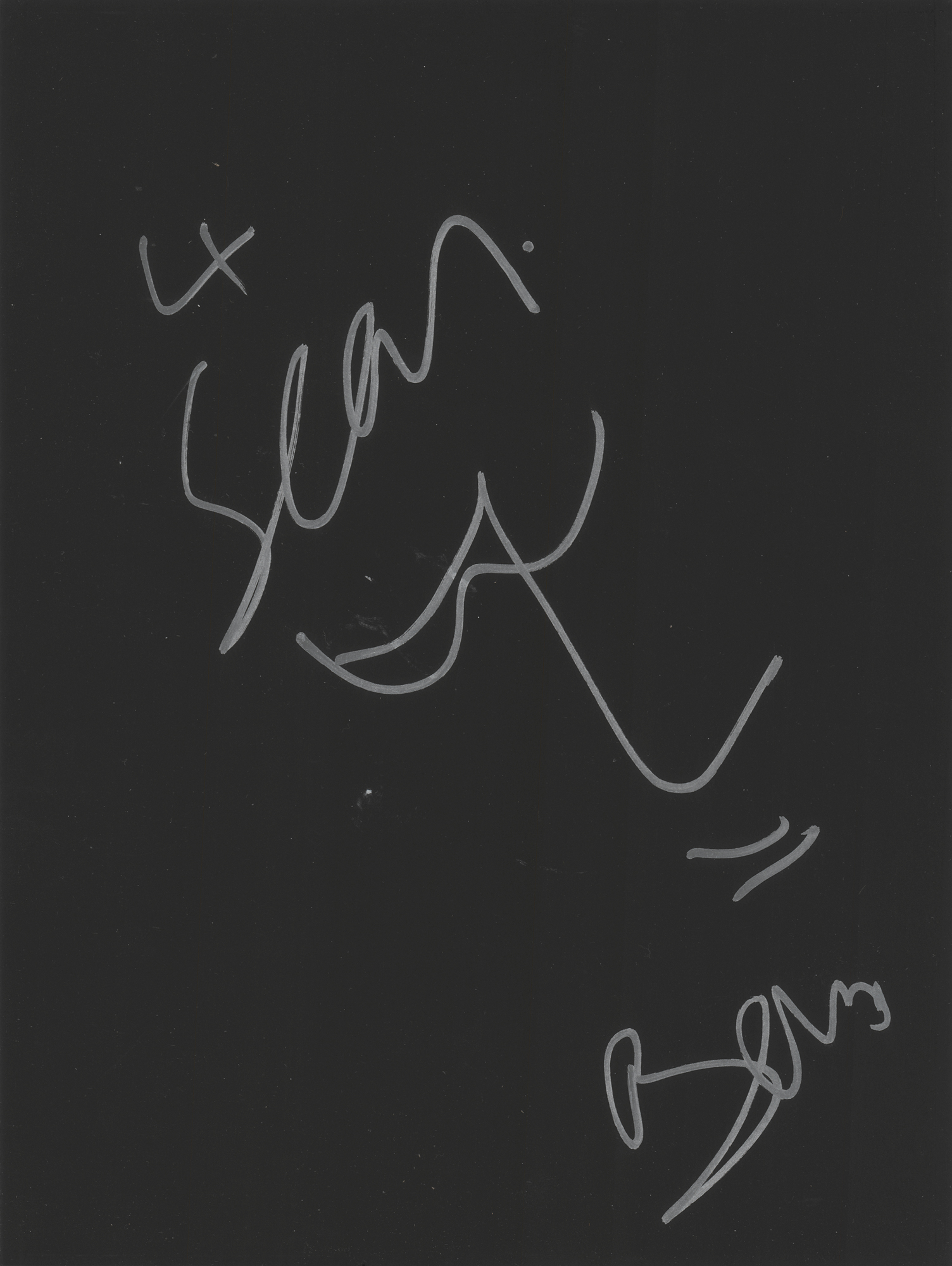 Original self-portrait sketch by U2 frontman Bono, who depicts himself in his 'Fly' glasses, accomplished in silver ink on a black 8.25 x 11 sheet, which is signed and inscribed, “4 Sean, Bono.” In fine condition.