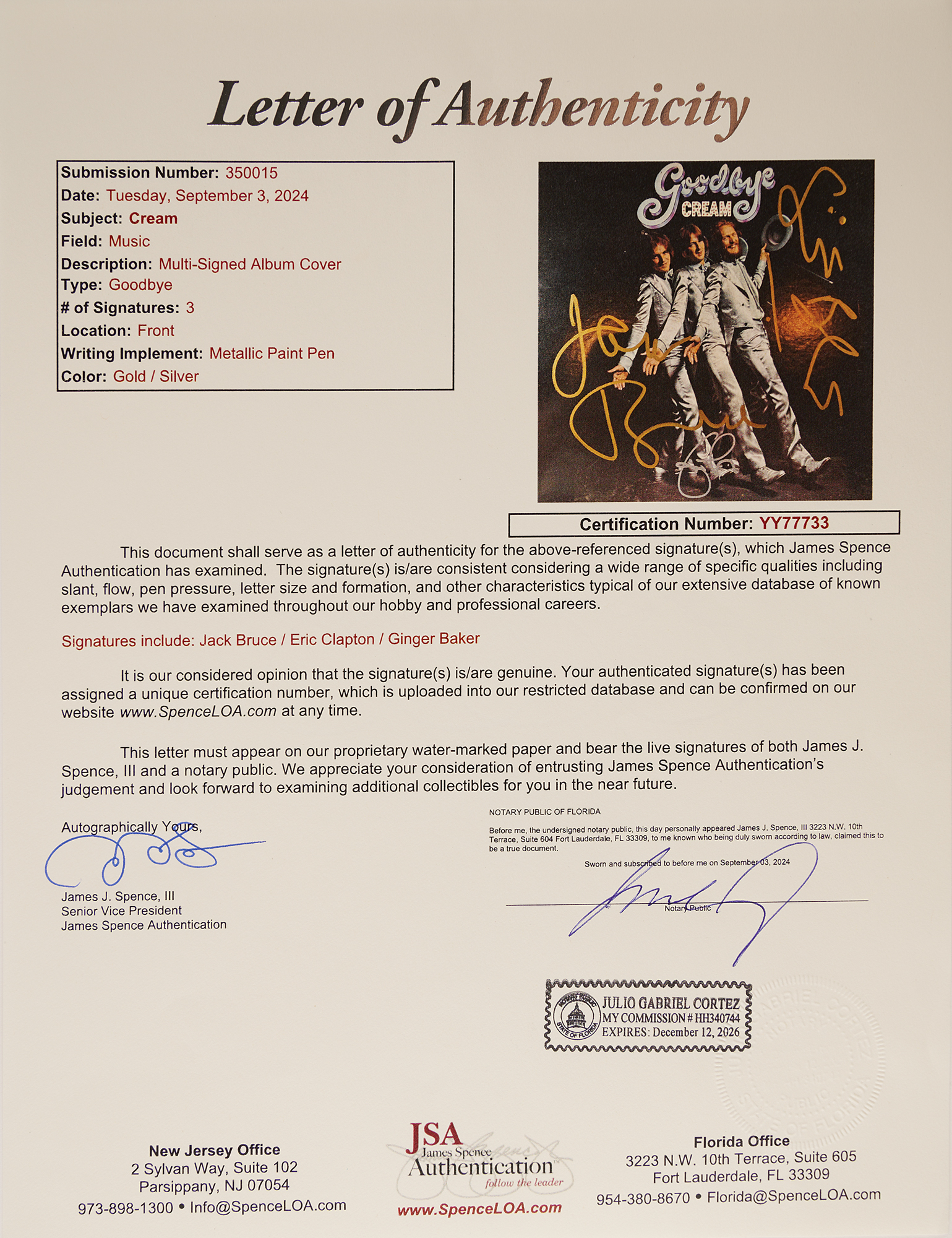 Goodbye Cream album signed prominently on the front cover in silver ink by Eric Clapton, and in gold ink by Ginger Baker and Jack Bruce. In fine condition. The record is included. Accompanied by a full letter of authenticity from JSA.