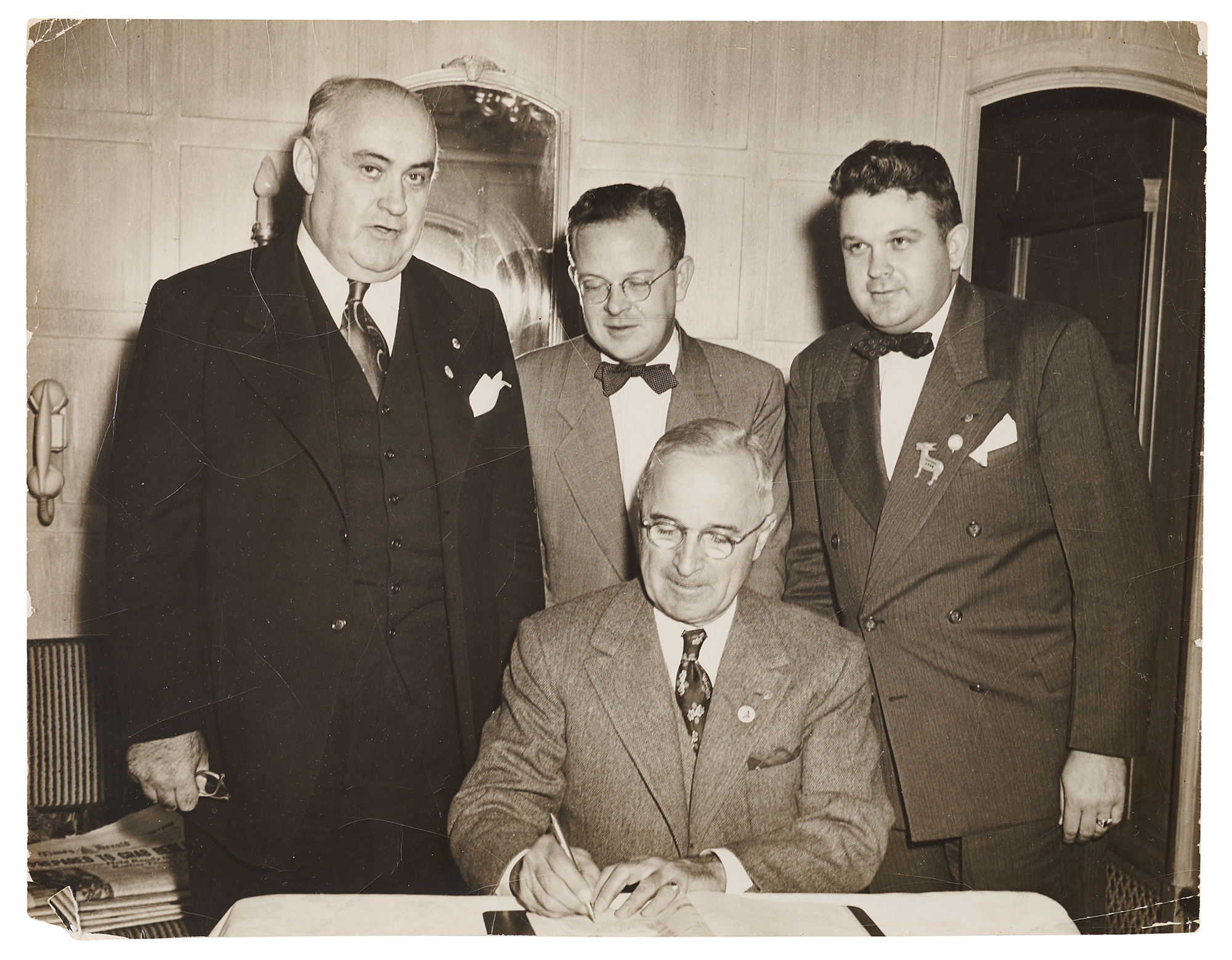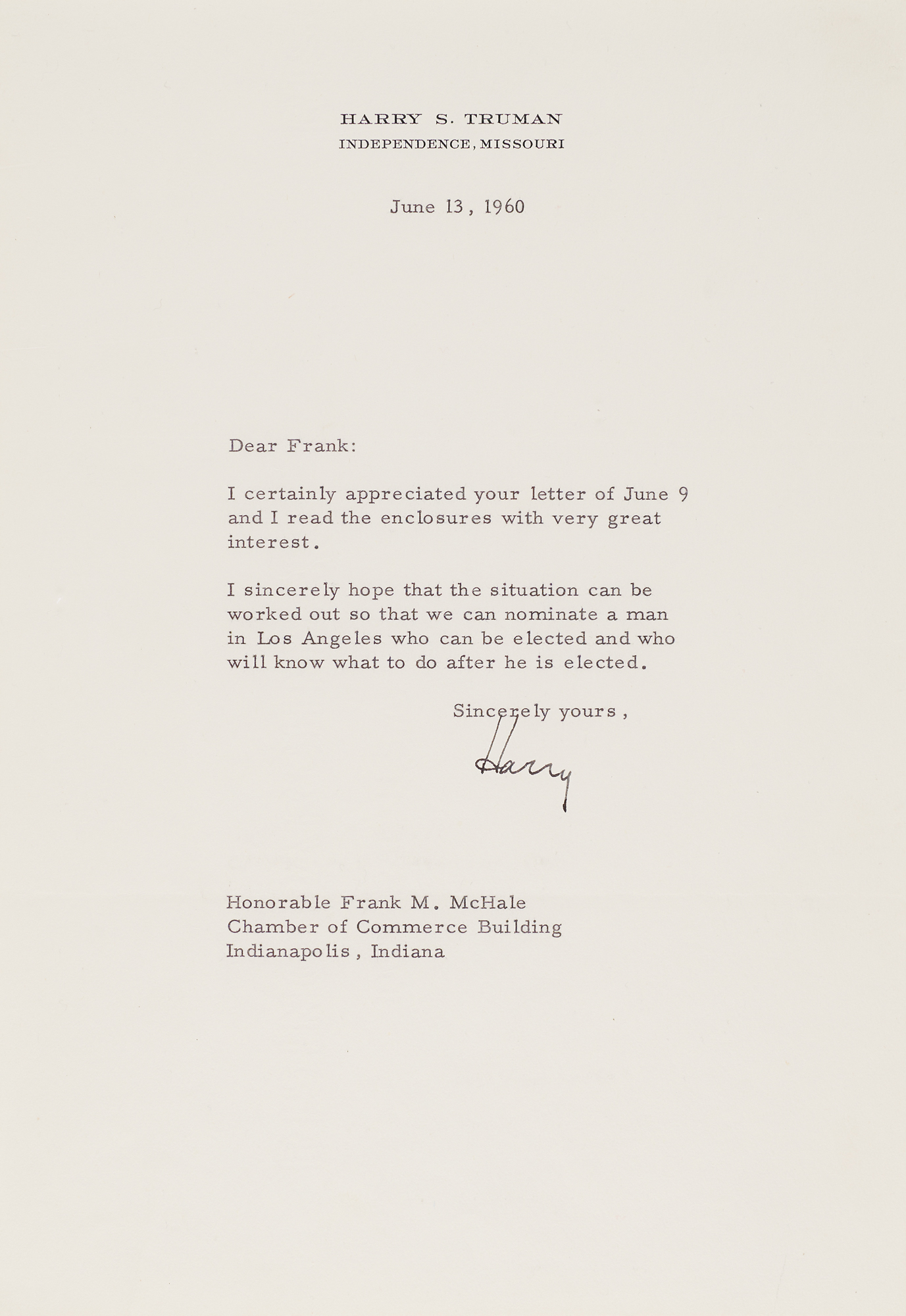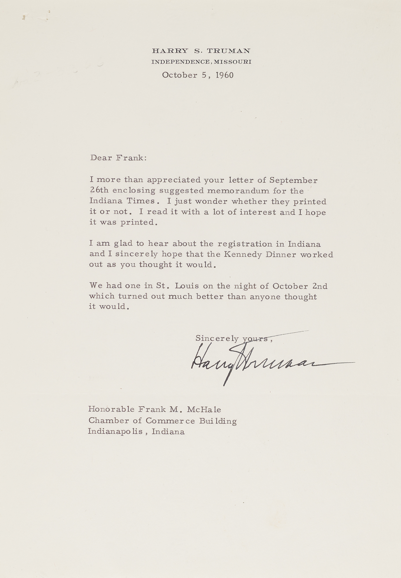 Collection of 14 TLSs signed as either “Harry” or “Harry S. Truman,” each one page, typed on his personal 7.25 x 10.5 letterhead, all addressed to Indianapolis politician Frank M. McHale, a longtime Democratic Party strategist and influential Indiana party leader. Although the letters date between 1953 and 1965, the majority (10) were sent by Truman during the year 1960 and offer a candid, behind-the-scenes view of his continued influence within the Democratic Party during a pivotal election year.