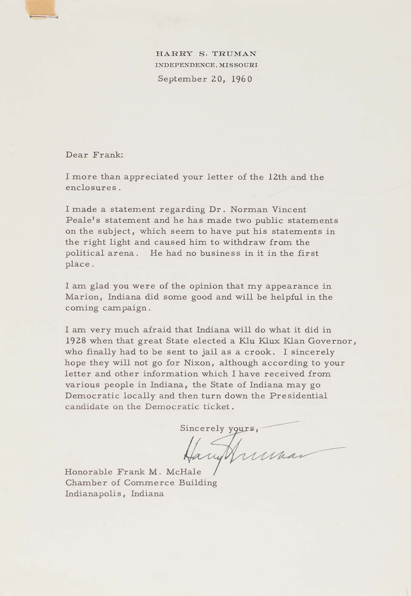 September 20, 1960: “I made a statement regarding Dr. Norman Vincent Peale's statement and he has made two public statements on the subject, which seem to have put his statements in the right light and caused him to withdraw from the political arena. He had no business in it in the first place…I am very much afraid that Indiana will do what it did in 1928 when that great State elected a Klu Klux Klan Governor, who finally had to be sent to jail as a crook. I sincerely hope they will not go for Nixon, although according to your letter and other information which I have received from various people in Indiana, the State of Indiana may go Democratic locally and then turn down the Presidential candidate on the Democratic ticket.”