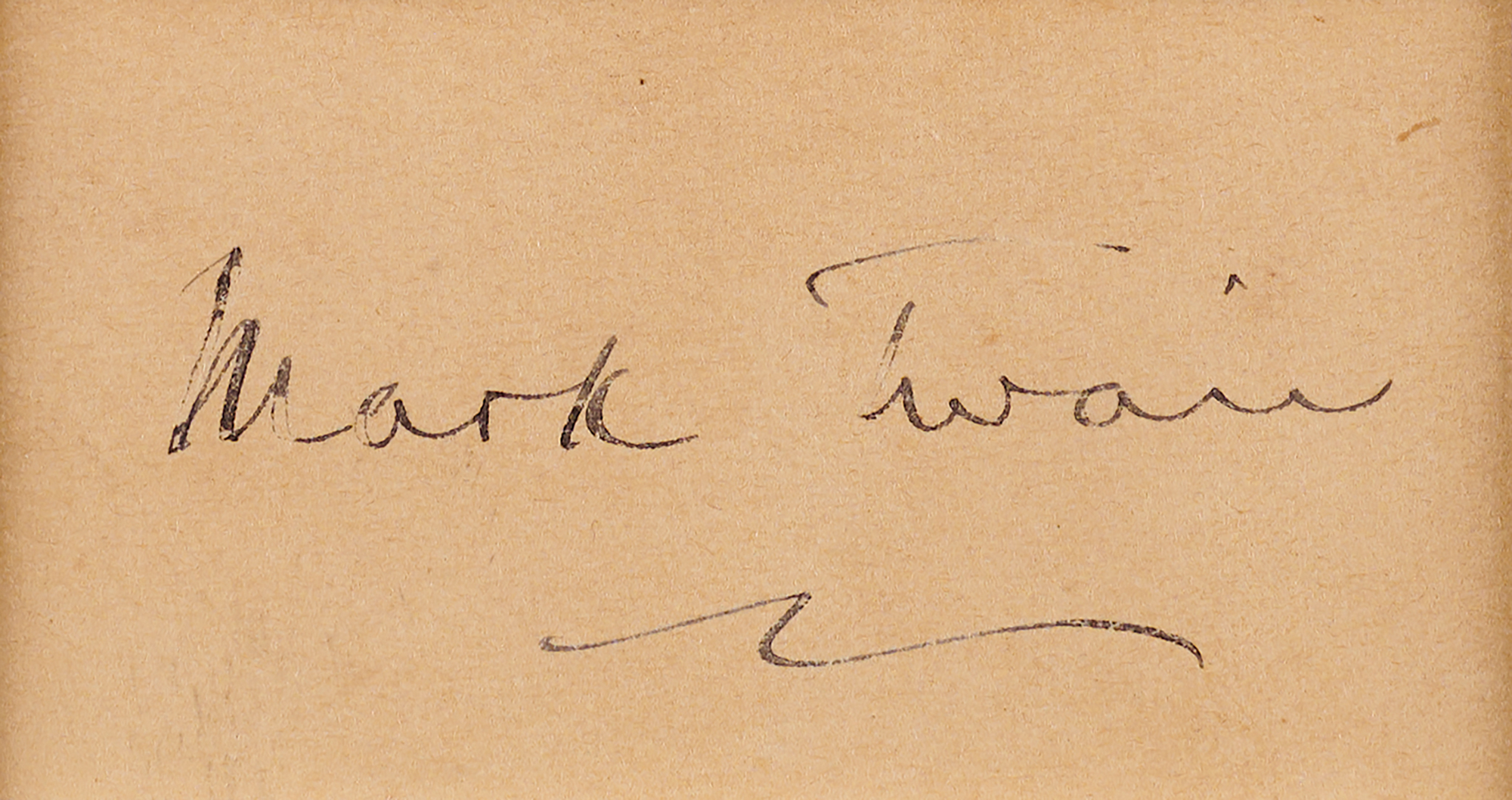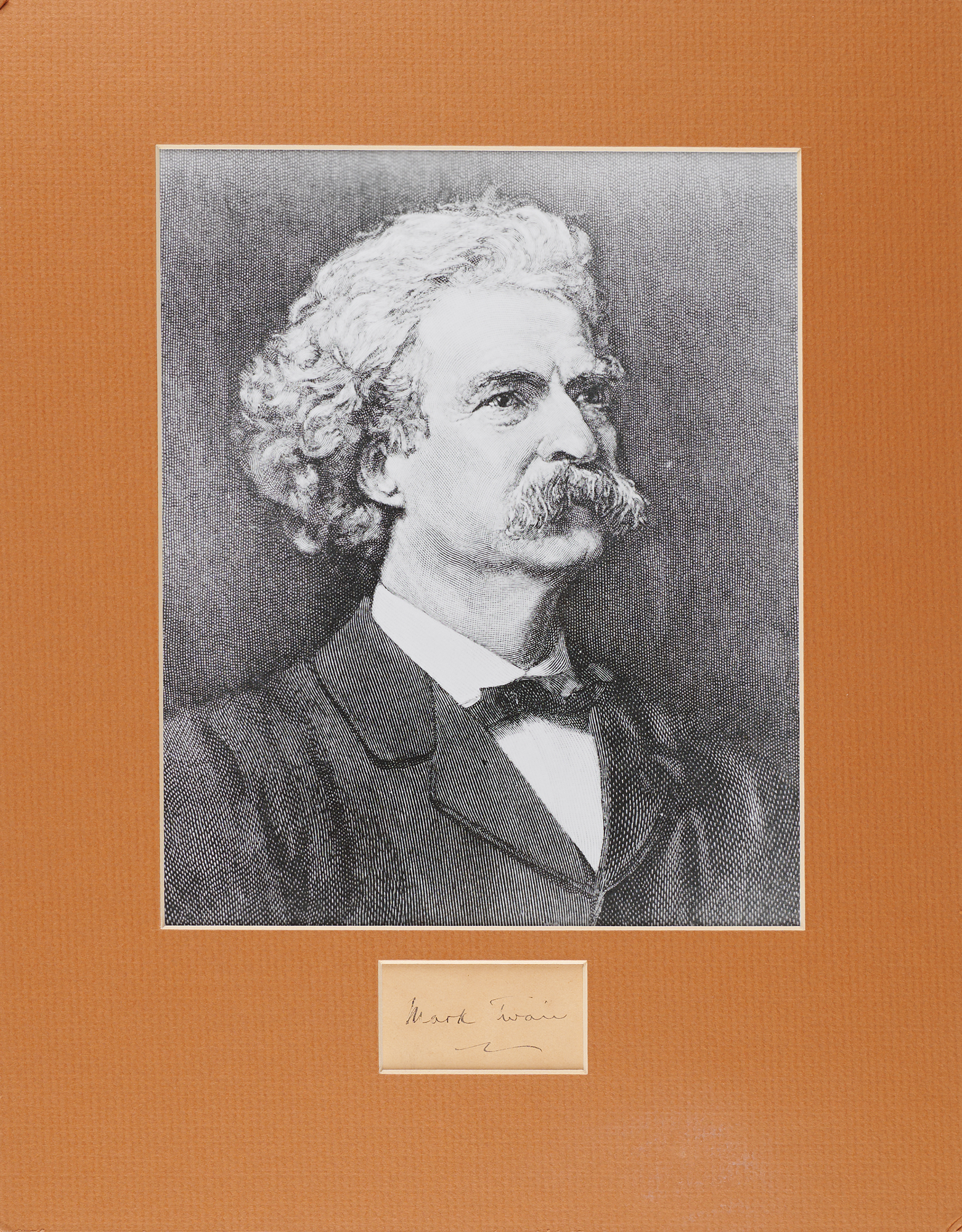 Neat ink 'nom-de-plume' signature of renowned wit Samuel L. Clemens, "Mark Twain," penned on an off-white 2.25 x 1.25 slip. Matted with a portrait of the scribe to an overall size of 11 x 14. In fine condition, with some minor ink skipping.