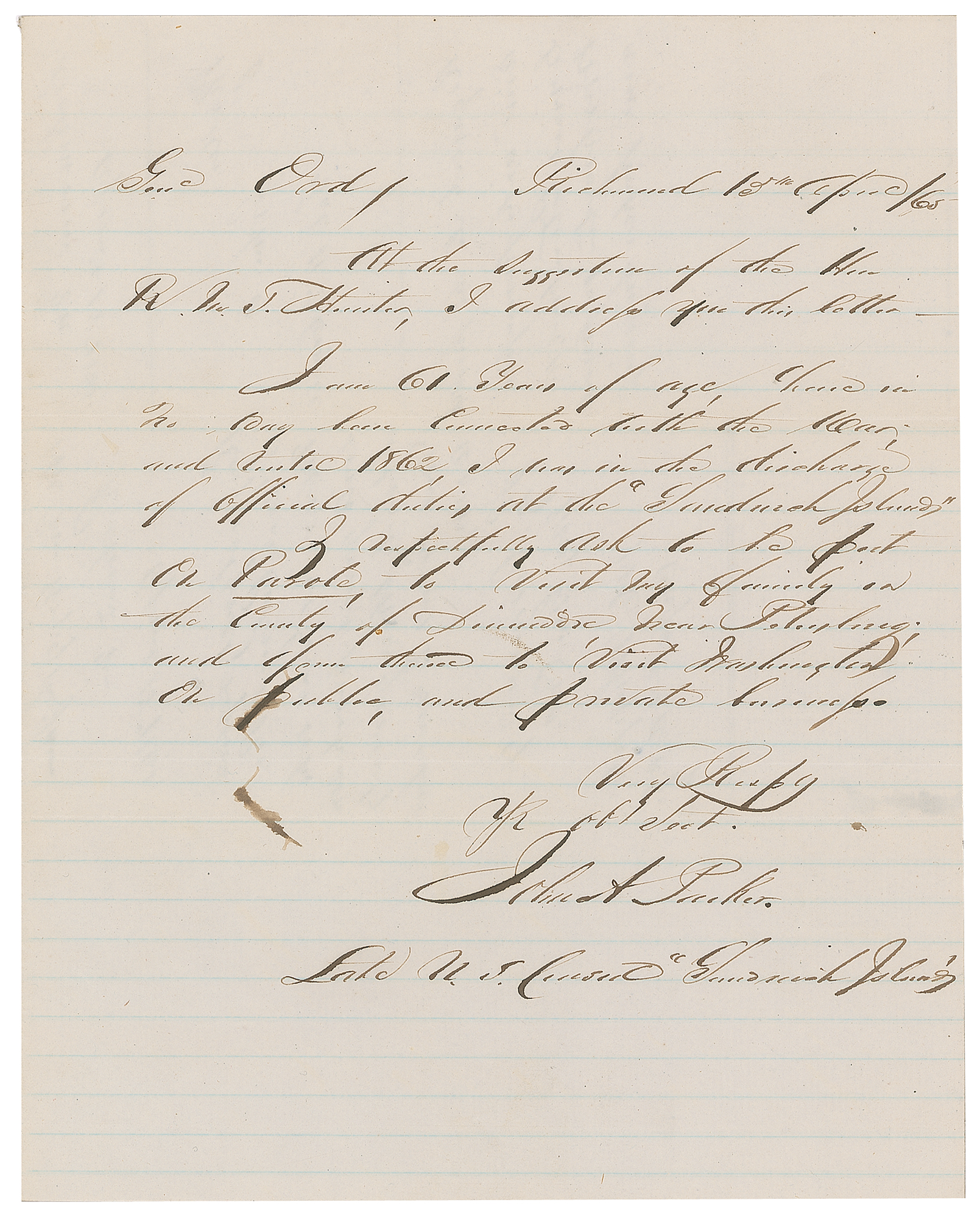 Early American consul of the Sandwich Islands, the original name given to the islands of Hawaii by Captain James Cook in 1778. Rare Civil War-dated ALS signed "John A. Parker, Late U.S. Consul 'Sandwich Islands,'" one page, 7.75 x 10, April 13, 1865. Handwritten letter to General Ord, in full: "I am 61 years of age, have in no way been connected with the war, and until 1862, I was in the discharge of official duties at the 'Sandwich Islands.' I respectfully ask to be put on parole, to visit my family in the county of Dinwiddie, near Petersburg; and from there to visit Washington on public and private business." Docketing on the reverse, dated April 15, 1865, issued from “Hd. Qrs. Ary. of the James, Richmond Va.” reads: “Respectfully referred to Gen. Patrick Pro. Marshal Genl. who will grant parole and direct him give [pass] to Genl. Grant to Genl. Lee's army." In fine condition.