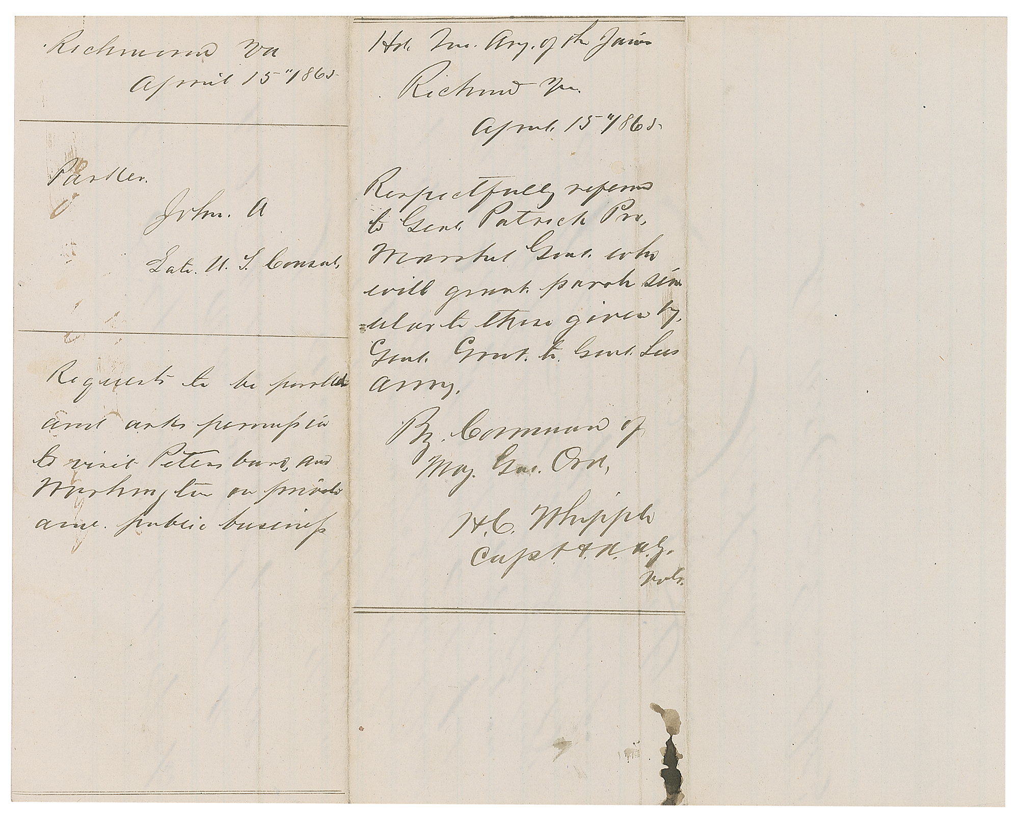Richmond fell to Union forces on April 3, 1865, and Lee surrendered at Appomattox on April 9; this document was executed just six days later, in the first uncertain days of Union occupation of the former Confederate capital. Its endorsement directs that Parker be passed through “to Genl. Lee’s army” — meaning the surrendered Army of Northern Virginia encamped in Dinwiddie County — perfectly captures the brief administrative moment when one army was victorious and the other dissolved, yet both were still sorting out the practical geography of peace. Major General Edward O.C. Ord commanded the Army of the James, while Brigadier General Marsena Patrick, as Provost Marshal General, oversaw the issuance of paroles and passes in occupied Virginia. Parker, a former U.S. Consul to the Sandwich Islands (Hawaii) who had returned to Virginia in 1862, appealed to his age, civilian status, and prior federal service, securing approval within forty-eight hours.
