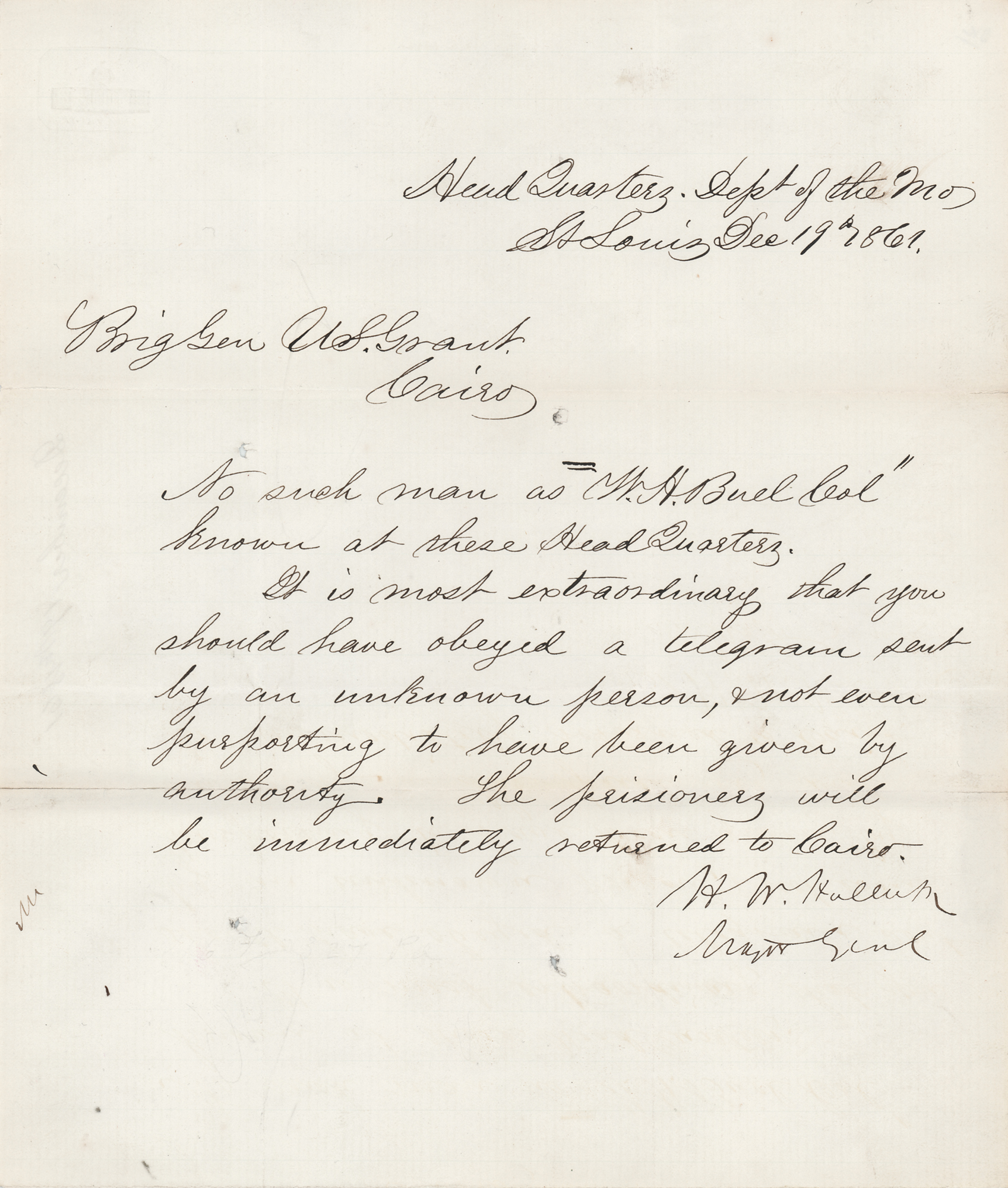 "It is most extraordinary that you should have obeyed a telegram sent by an unknown person"—six weeks after taking command of the Department of the Missouri, Henry Halleck chides U. S. Grant for trusting an unauthorized telegram and releasing prisoners from Cairo