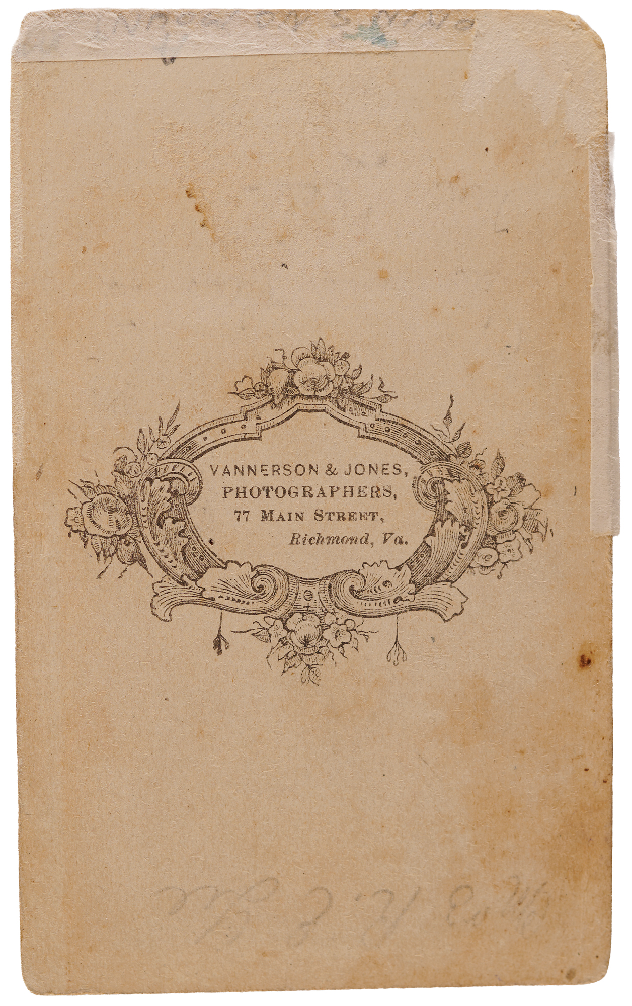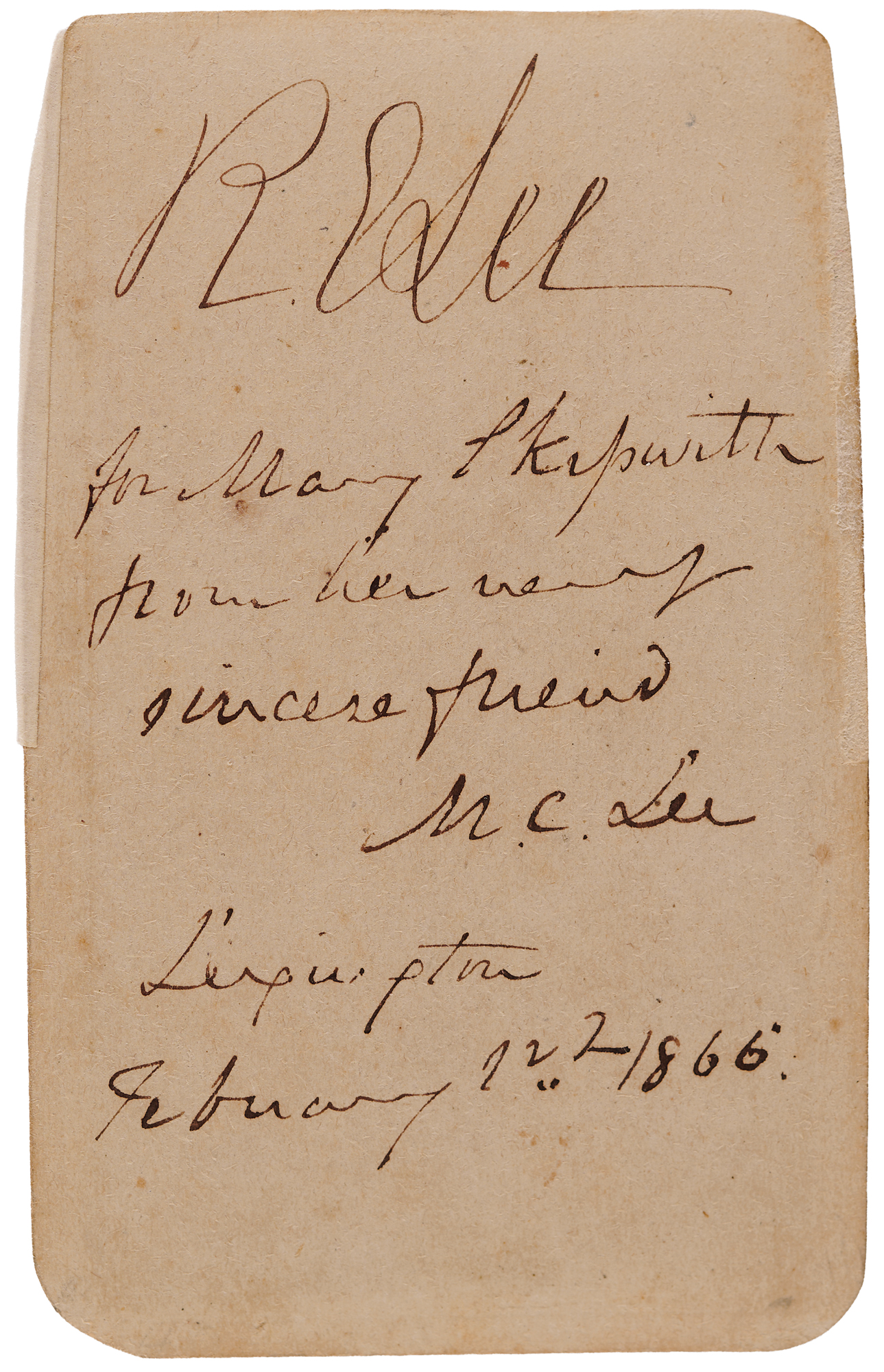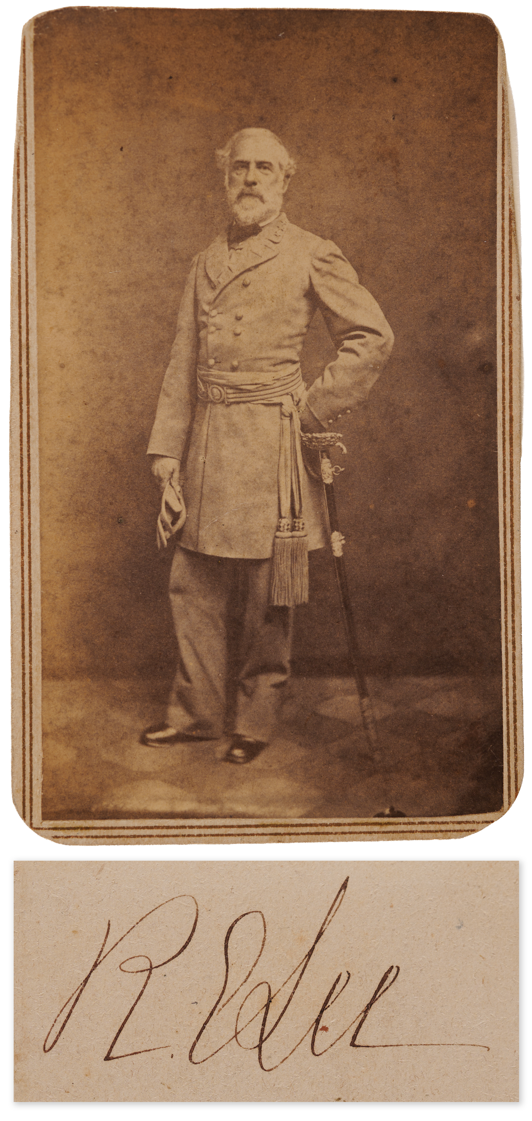Rare original 2.25 x 3.75 carte-de-visite portrait of Confederate General Robert E. Lee in a full-figure pose, dressed in his military uniform, with his DeVisme presentation sword (given to him by the ladies of Baltimore) in one hand and his gloves in the other, signed neatly on the reverse in ink, “R. E. Lee.” The reverse is also signed and inscribed by Lee’s wife, Mary Custis Lee: “For Mary Skipwith from her very sincere friend, M. C. Lee, Lexington, February 1st, 1866.” Includes a 2.25 x 4 carte-de-visite photograph of Mary Custis Lee published by Vannerson & Jones of Richmond, Virginia. In fine condition, with lightly trimmed edges. Of the eight photographs of Lee known to have been taken during the Civil War, the present is the only full-standing portrait. ‘The standing view is especially notable in that Lee is wearing both his military sash and his dress sword—the only time he was ever photographed in his sash’ (Meredith, The Face of Robert E. Lee, p. 40).