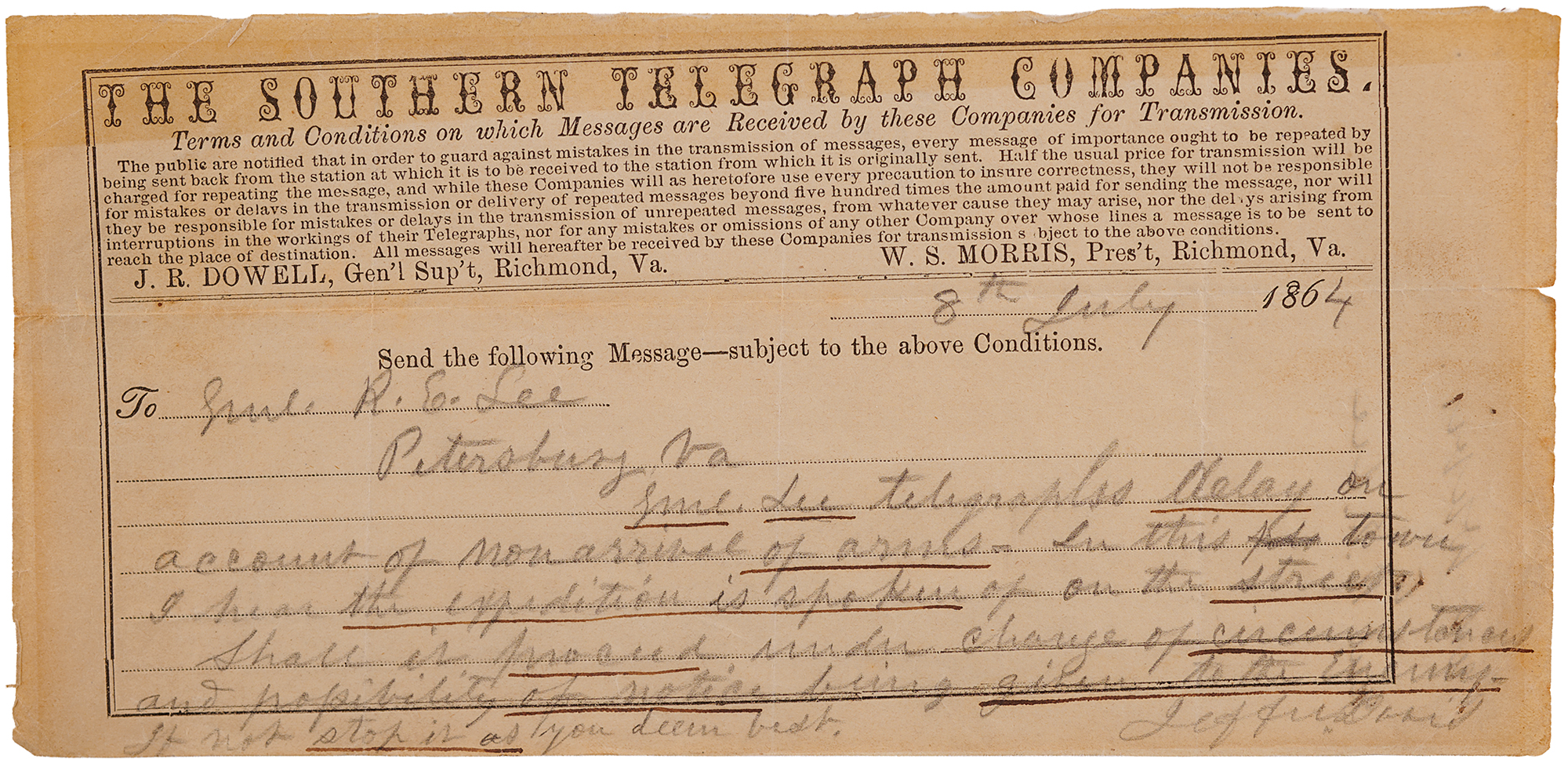 Civil War-dated ALS signed as president of the Confederate States, signed “Jeffer. Davis,” one page on an 8.5 x 4 sheet from The Southern Telegraph Company, July 8, 1864. Handwritten letter in pencil directed to Confederate General Robert E. Lee, who was then in defense of Petersburg, Virginia, in full: "Genl. Lee telegraphs delay on account of nonarrival of arms. In this town I hear the expedition is spoken of on the streets. Shall it proceed, under change of circumstances and possibility of notice being given to the enemy. If not stop it as you deem best.” In fine condition, with a thin tape stain along the top edge.