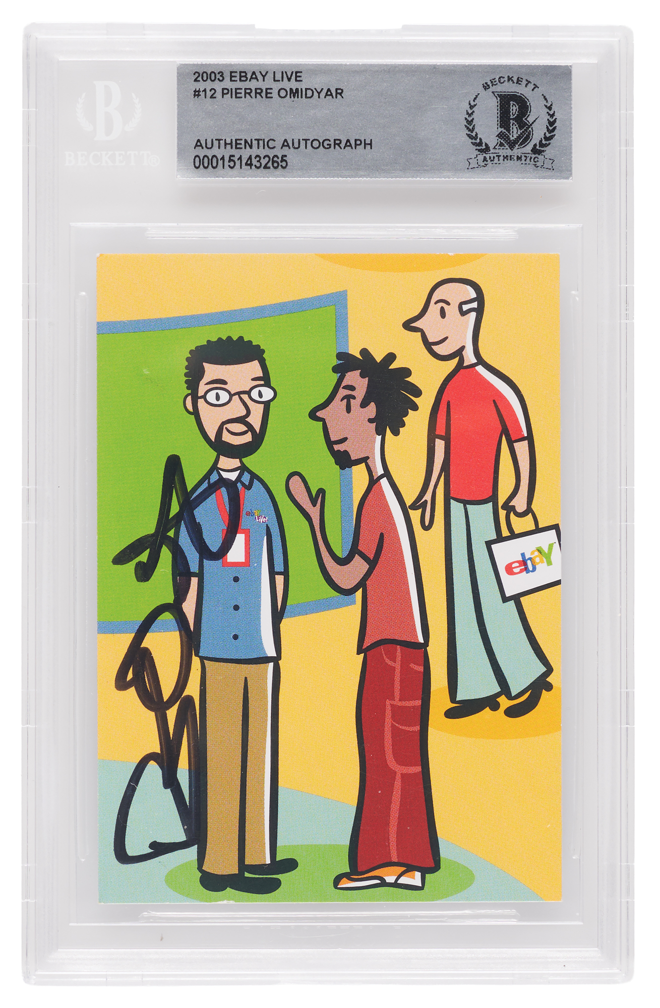 French-born Iranian-American billionaire technology entrepreneur, software engineer, and philanthropist (born 1967) who founded eBay and served as its chairman from 1998 to 2015. 2003 eBay Inc. #12 Pierre Omidyar eBay Live! trading card, signed vertically in black felt tip. Encapsulated in a Beckett authentication holder.