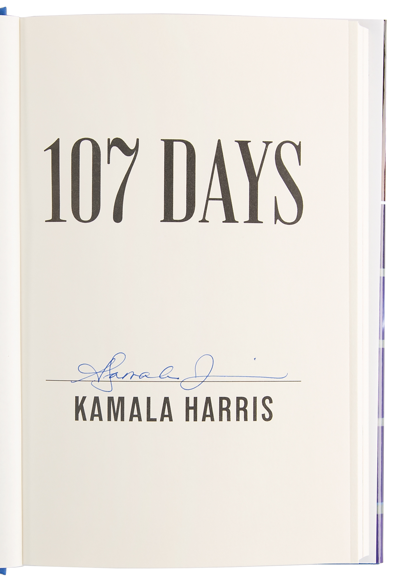 Signed book: 107 Days. First edition. NY: Simon & Schuster, 2025. Hardcover with dust jacket, 6.25 x 9.25, 304 pages. Signed on the half-title page in blue ink by Kamala Harris. In very fine condition.
