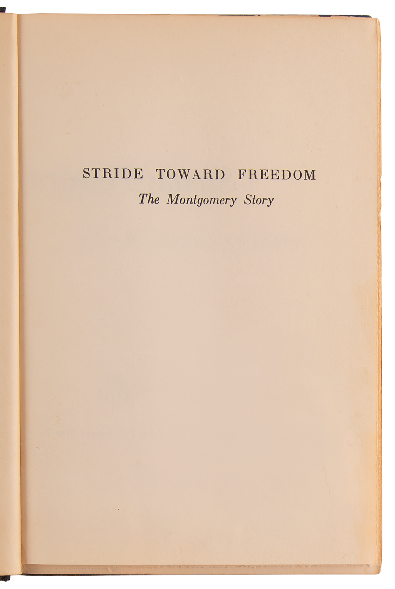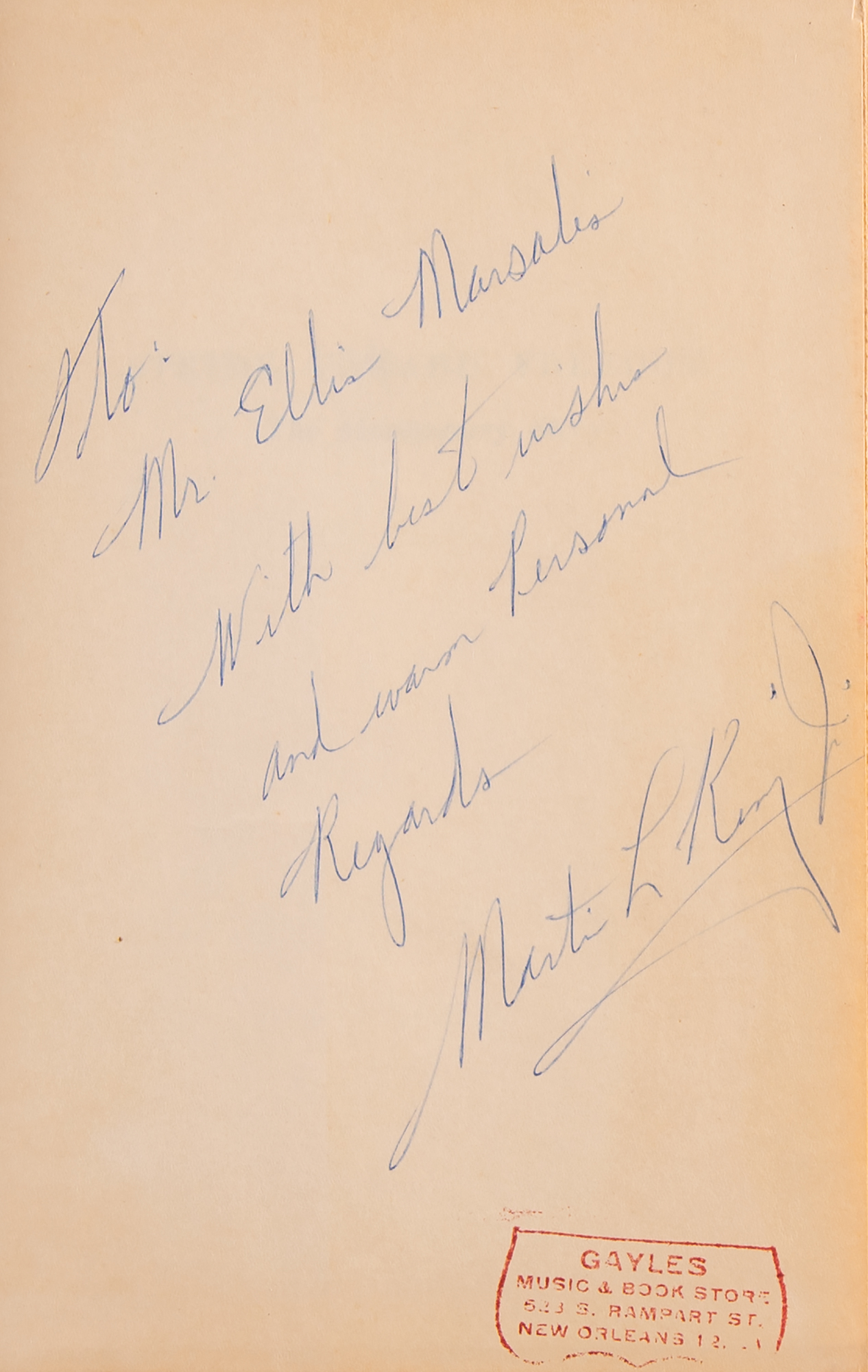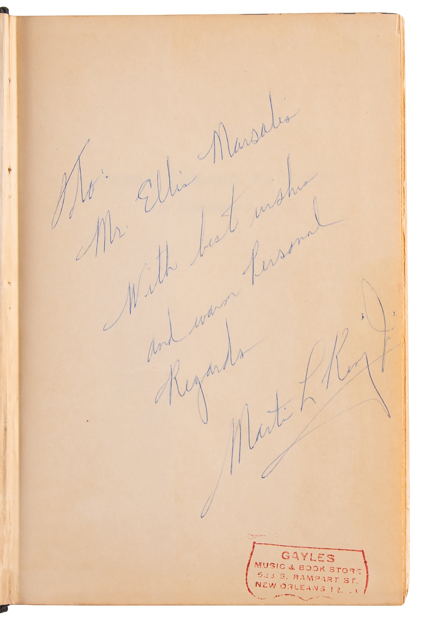 Signed first edition of Martin Luther King, Jr.’s Stride Toward Freedom, presented to the founder of the Marsalis Mansion Motel, a historic New Orleans lodging that provided safe harbor for Black travelers during segregation