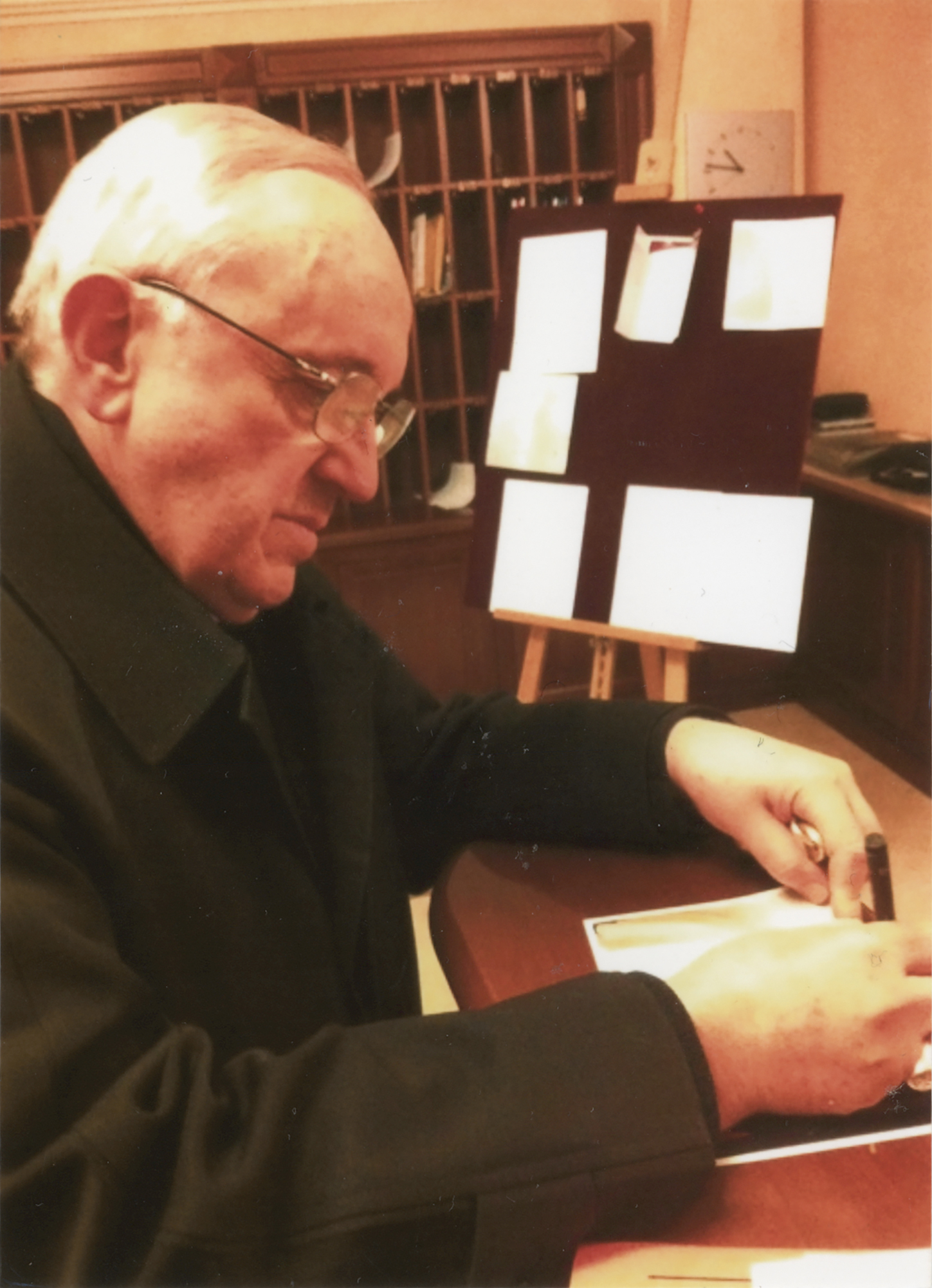 Color satin-finish 8.25 x 6 photo of Cardinal Francis kneeling before and embracing Pope John Paul II, signed in black felt tip as archbishop, "Bergoglio, Erzbischof von Buenos Aires." In very fine condition. Accompanied by an image taken at the time of signing.