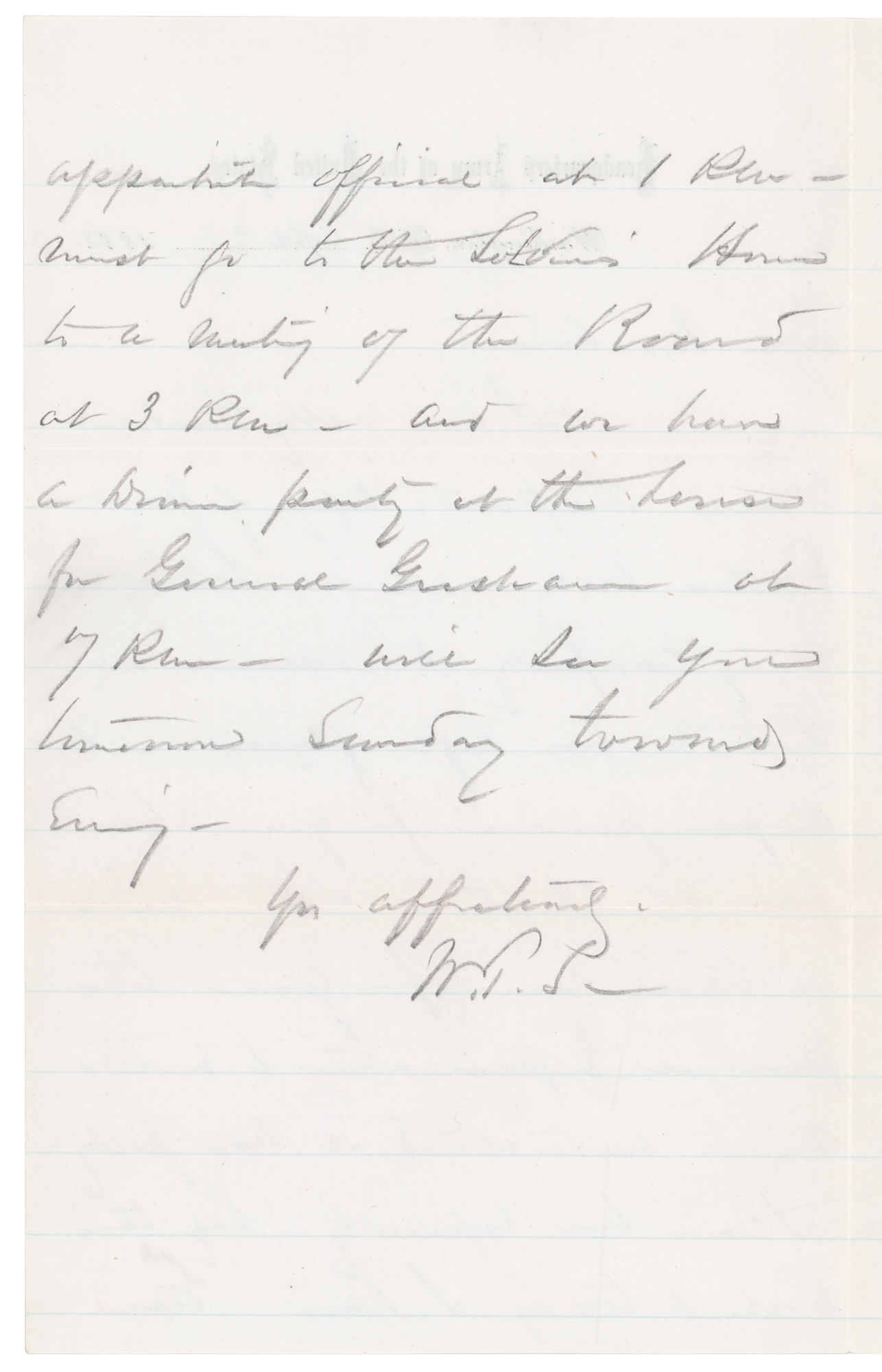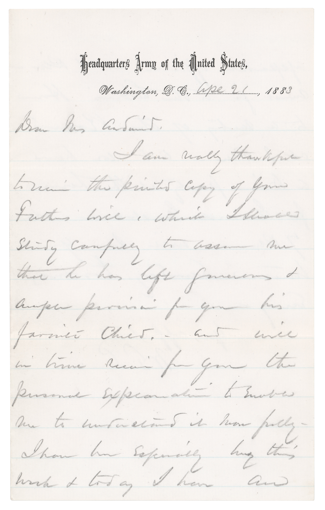 ALS in pencil, signed “W. T. S.,” one page both sides, 5 x 8, Headquarters Army of the United States letterhead, April 21, 1883. Handwritten letter to unidentified woman, in full: “I am really thankful to receive the printed copy of your father’s will, which I shall study carefully to assure me that he has left generous & ample provisions for you his favorite child – and will in time receive for you the personal explanation to enable me to understand it more fully. I have been especially busy this week & today I have an appointment official at 1 PM – must go to the Soldiers Home to a meeting of the Board at 3 PM – and we have a Dinner party at the house for General Grisham at 7 PM – will see you tomorrow Sunday toward evening.” In fine condition.