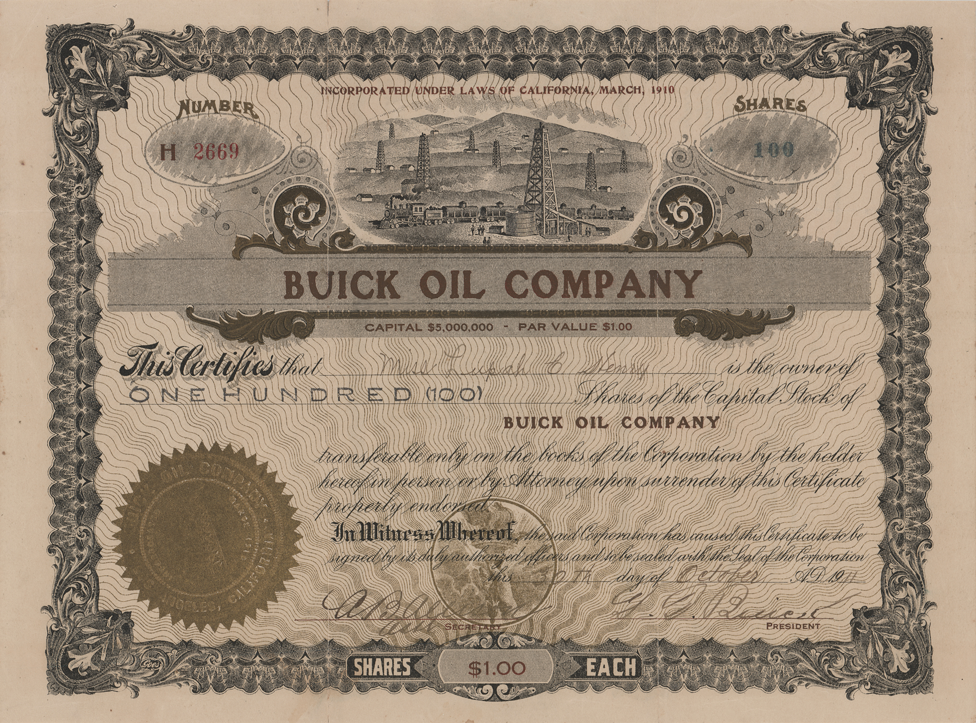 Automotive engineer and businessman (1854-1929) who founded the automobile manufacturing company whose name survives as a division of General Motors. Partly-printed DS, signed “D. D. Buick,” one page, 10.75 x 8, October 30, 1911. Stock certificate issued to Miss Lupah C. Henry for 100 shares of capital stock in the Buick Oil Company, with the upper section featuring an engraved vignette of an oil field, signed at the conclusion by David Dunbar Buick as president of the company. Lower left bears the company's embossed seal. In fine condition.