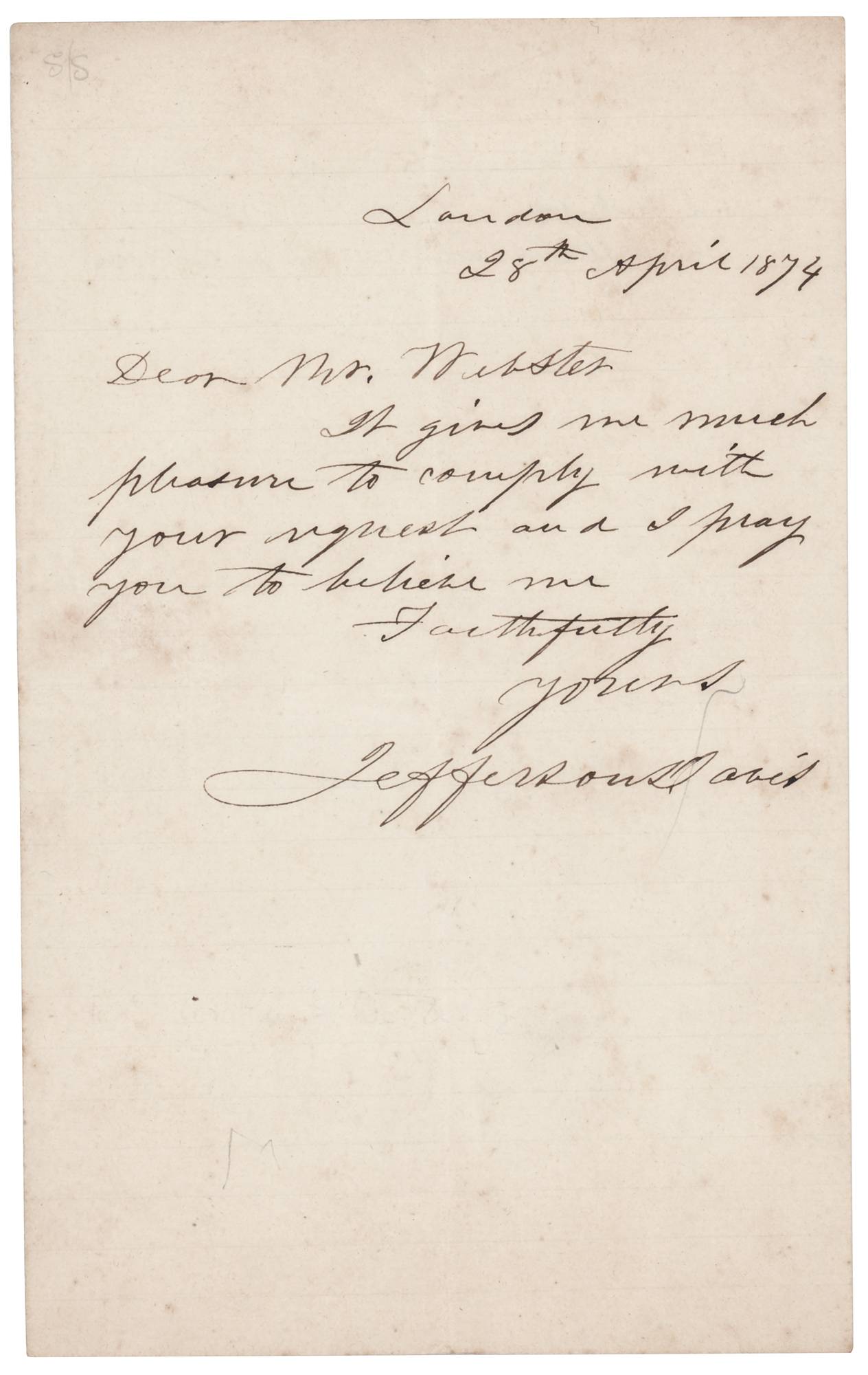 ALS, signed "Jefferson Davis," one page, 5 x 8, April 28, 1874. Handwritten letter to "Mr. Webster," in full: "It gives me much pleasure to comply with your request and I pray you to believe me." In fine condition.