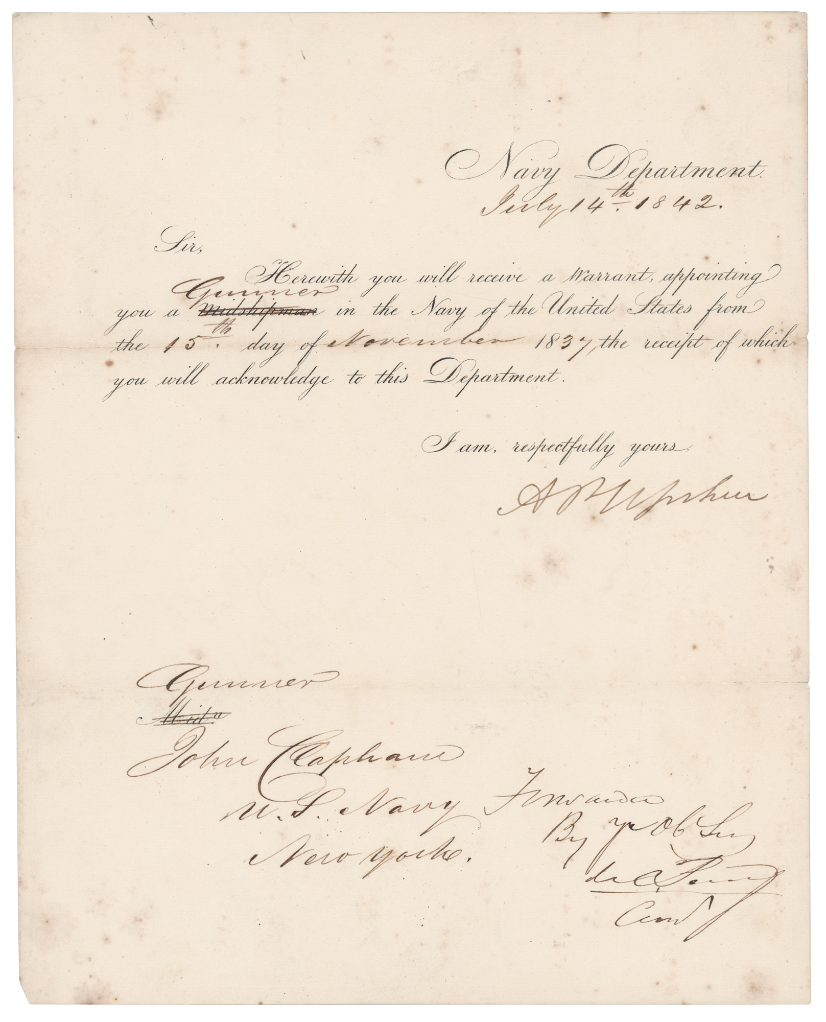 American naval officer (1794-1858) who took a leading role in the establishment of international trade with the formerly insular nation of Japan. AES signed "Forwarded, by y'r ob. ser., M. C. Perry, Comd.," at the conclusion of a circular letter signed by Secretary of the Navy Abel P. Upshur, one page, 7.75 x 9.75, Navy Department letterhead, July 14, 1842, to Gunner John Clapham of the U.S. Navy. In full: "Herewith you will receive a warrant appointing you a Gunner in the Navy of the United States from the 15th day of November 1837, the receipt of which you will acknowledge to this Department.". In fine condition, with scattered light foxing.