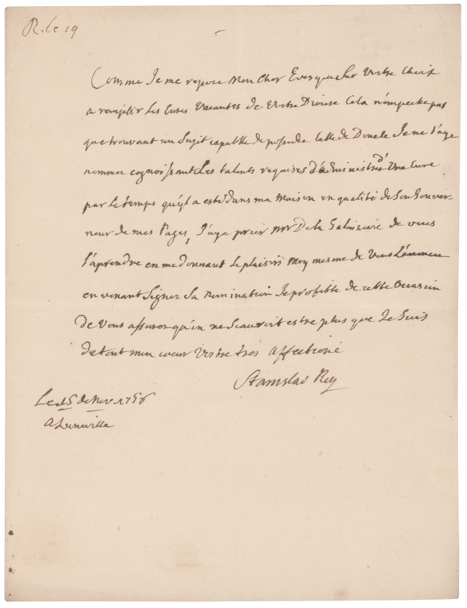 King of Poland, Grand Duke of Lithuania, Duke of Lorraine, and a count of the Holy Roman Empire (1677–1766). ALS in French, signed “Stanislas Rey,” one page, 6.5 x 8.5, November 16, 1756. Untranslated handwritten letter by King Stanislaw I Leszczynski. In fine condition.