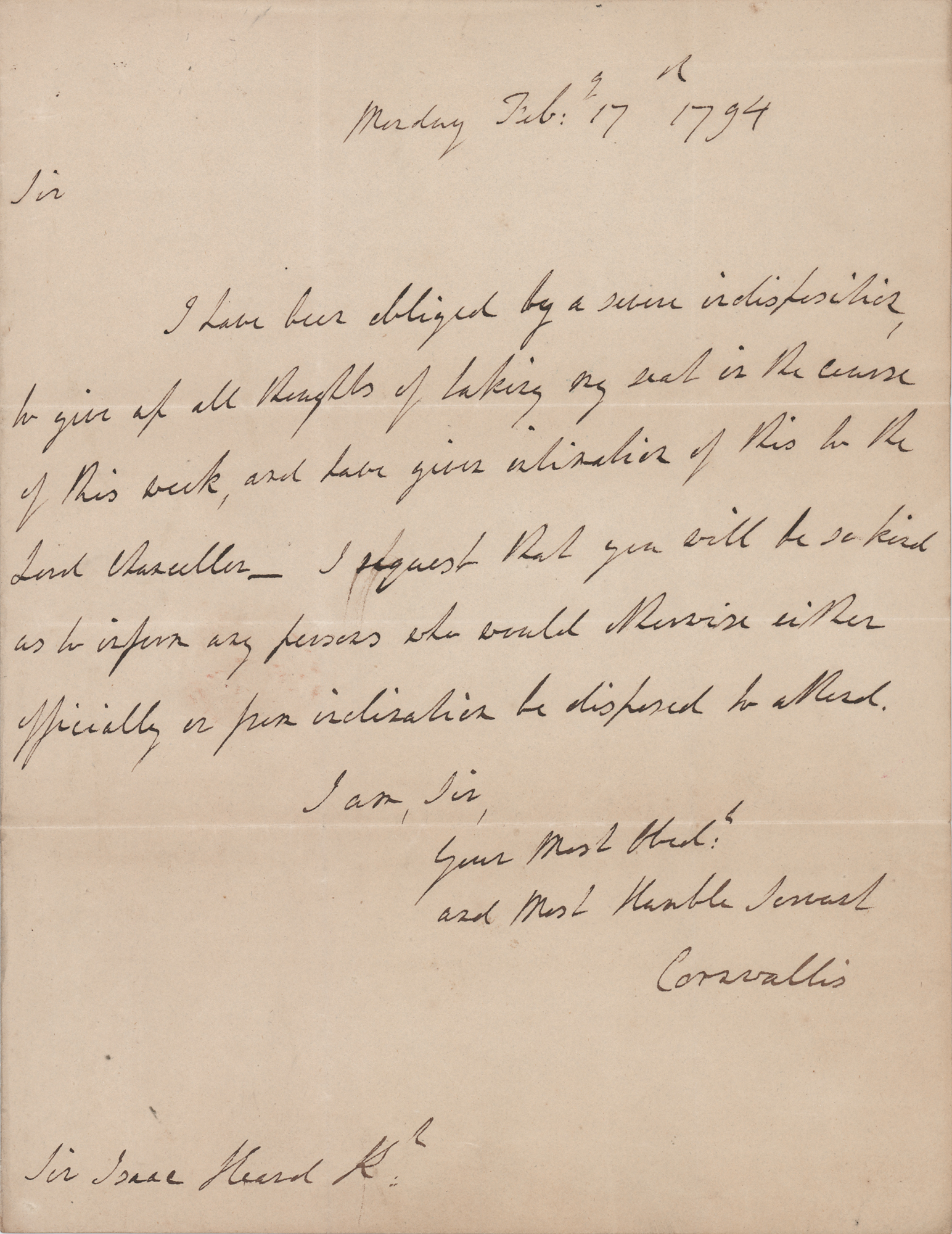 English general (1738–1805) who fought against Washington during the American Revolution and was finally defeated at Yorktown. The crushing defeat aroused much antiwar sentiment in England, and hostilities thereafter tapered off until the final withdrawal of British troops in 1783. ALS signed “Cornwallis,” one page, 7.5 x 9.75, February 17, 1794. Handwritten letter to Sir Isaac Heard, in full: "I have been obliged by a severe indisposition, to give up all thoughts of taking my seat in the course of this week, and have given intimation of this to the Lord Chancellor—I request that you will be so kind as to inform any persons who would otherwise either officially or from inclination be disposed to attend." In fine condition.