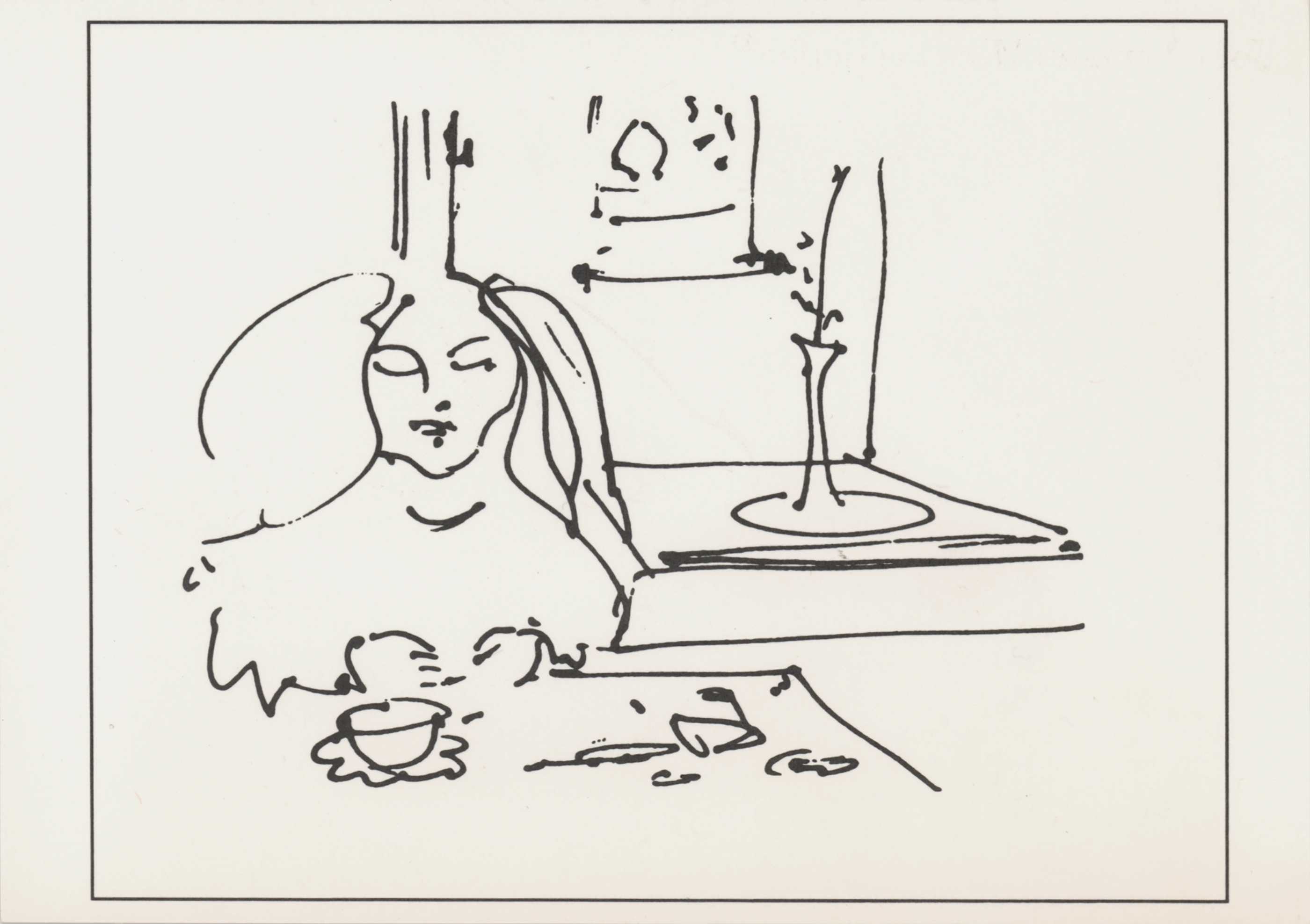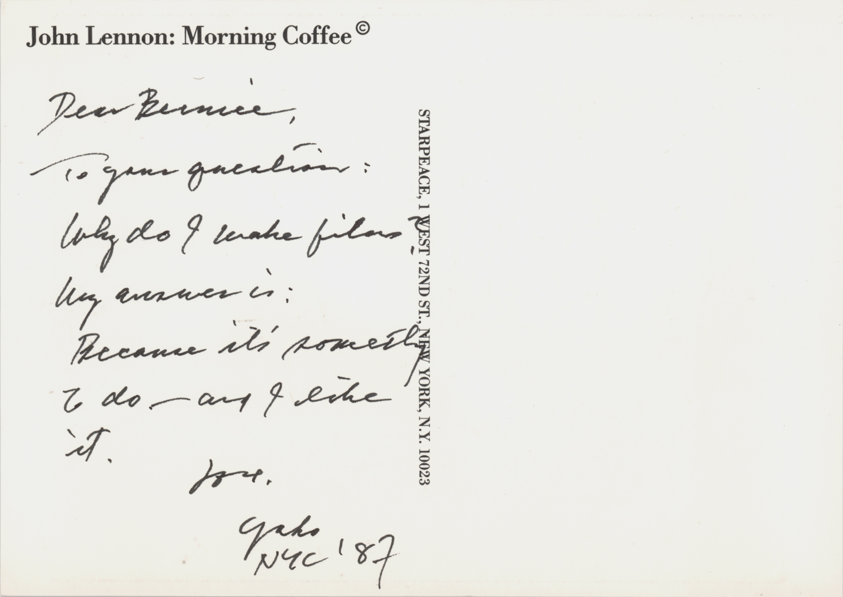 ALS signed “Love, Yoko, NYC '87,” one page on a 6 x 4 postcard depicting John Lennon's 'Morning Coffee' doodle, dated 1987. Handwritten letter to filmmaker Bernice Renaud, in full: "To your question: why do I make films? My answer is: Because it's something to do—and I like it." In very fine condition. Accompanied by the original mailing envelope.