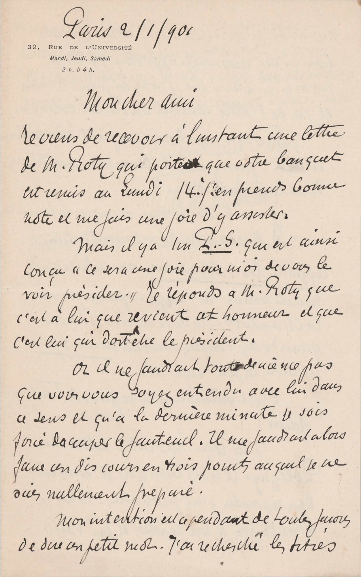 French neurologist (1857–1904) best known as the namesake of Tourette syndrome, a neurological condition characterized by tics; his main contributions in medicine were in the fields of hypnosis and hysteria. ALS in French,, three pages on two adjoining sheets, 4.25 x 7, 29 Rue de l'Université letterhead, January 2, 1901. Handwritten letter to Emile Goubert, a doctor known for his research on forensic medicine and pathological anatomy. De la Tourette discusses 'gold bromide,' used primarily in neurology and psychiatry, with the hypothesis of its specific effects and actions on the central nervous system. In part (translated): "I have just received a letter from Mr. Roty informing me that your banquet has been postponed to Monday the 14th. I take note of this and look forward to attending. However, there is a postscript that reads, 'It will be a pleasure for me to have you preside over it.' I am replying to Mr. Roty that this honor belongs to him and that he should be the one to preside.