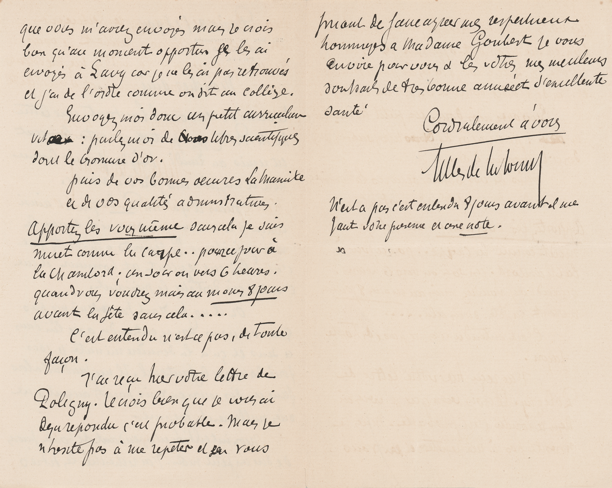 I received your letter from Poligny yesterday. I believe I've already replied, probably. But I don't hesitate to repeat myself, asking you to give my respectful regards to Mrs. Goubert. I send you and yours my best wishes for a happy new year and excellent health." In very fine condition.