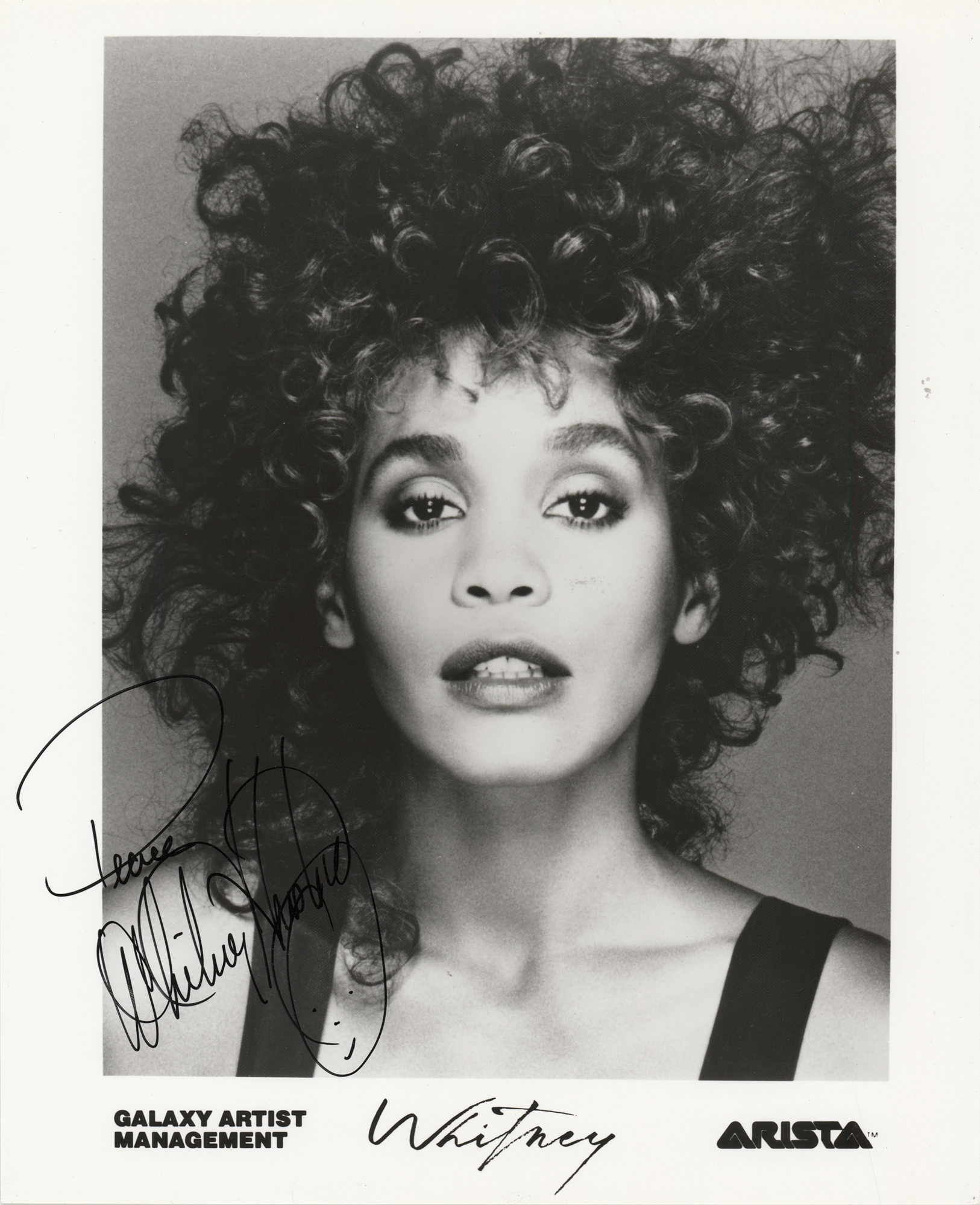 Wonderful glossy 8 x 10 Arista Records publicity photo of Houston early in her career, signed in black felt tip, "Peace, Whitney Houston," adding a smiley face below. In fine condition.