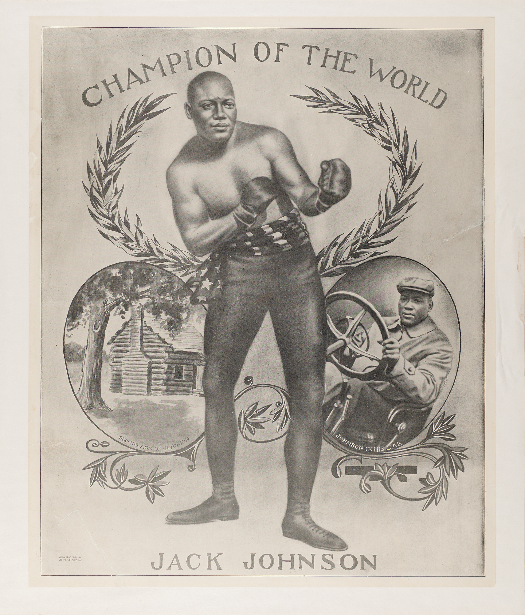 Scarce original circa 1909 poster featuring Jack Johnson as "Champion of the World," 15.75 x 19.25, featuring him in a full-figure boxing pose, flanked by one image of his birthplace and another of him driving his car. The printed notice in the lower left corner reads: "Copyright 1909 by Brandt & Scheible." Professionally linen-backed and in very good to fine condition, with several expertly repaired tears. Printed shortly after Johnson took the heavyweight crown from Tommy Burns in Sydney, Australia, at the end of 1908, this is a classic early boxing piece.