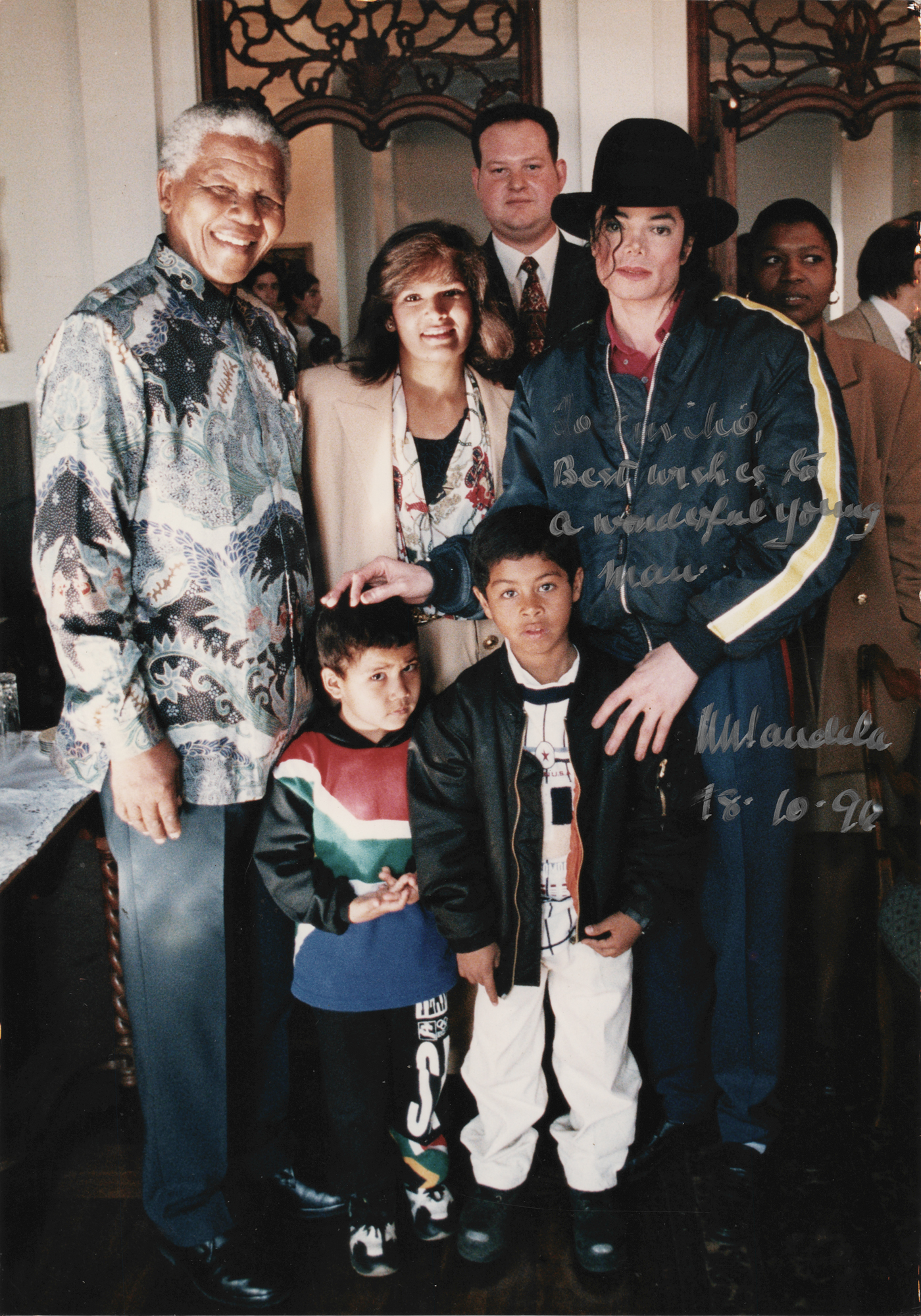 Color glossy 8.25 x 11.75 photo of Nelson Mandela and pop star Michael Jackson posing with Mandela's household manager, Beatrice Damon, and her two children, signed and inscribed in silver ink, "To Emilio, Best wishes to a wonderful young man, N. Mandela, 18. 10. 96." In very good condition, with overall bends and creases. This photo was taken at Mandela's home in Pretoria on July 20, 1996, and is inscribed to one of the children pictured.